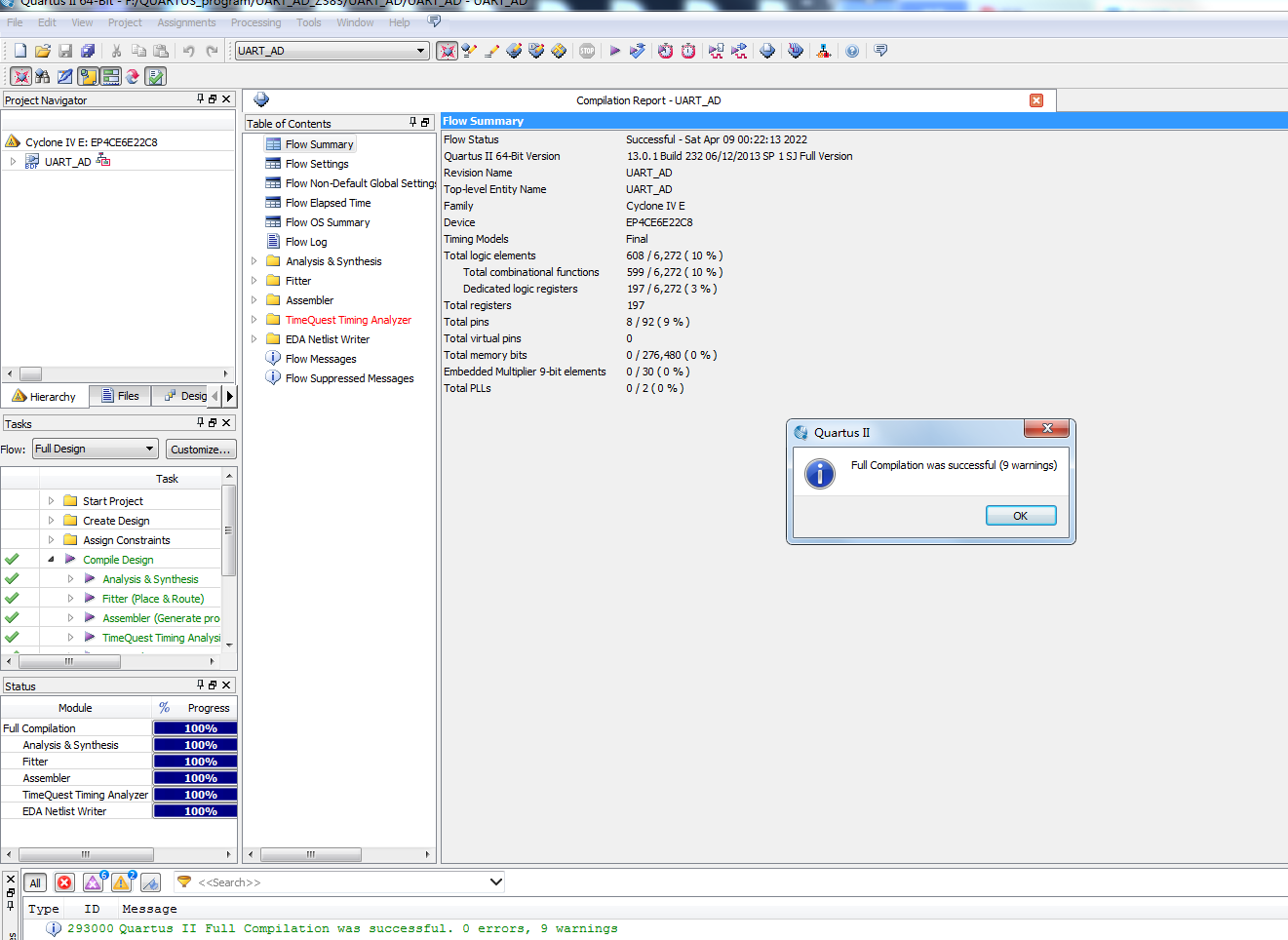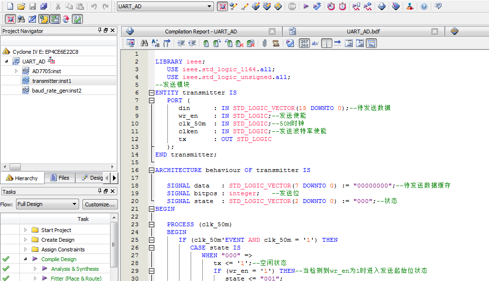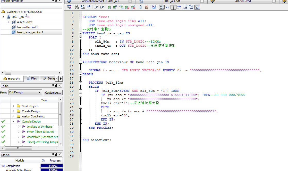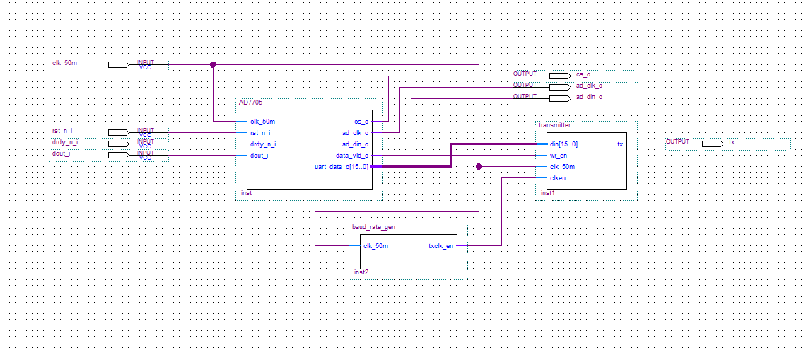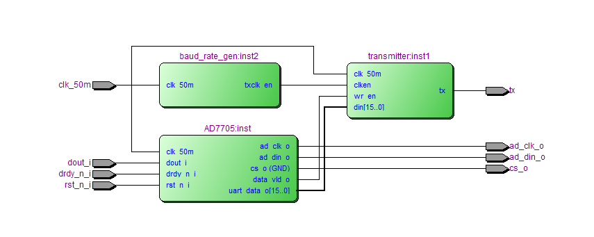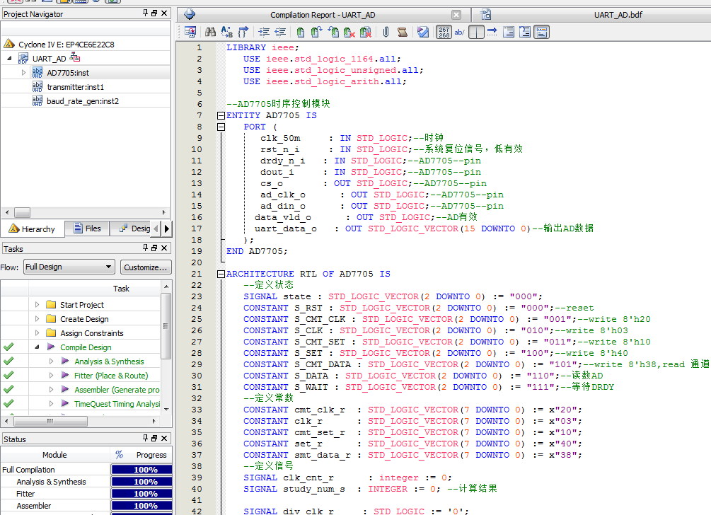 名称:AD7705驱动及UART发送设计VHDL代码Quartus仿真