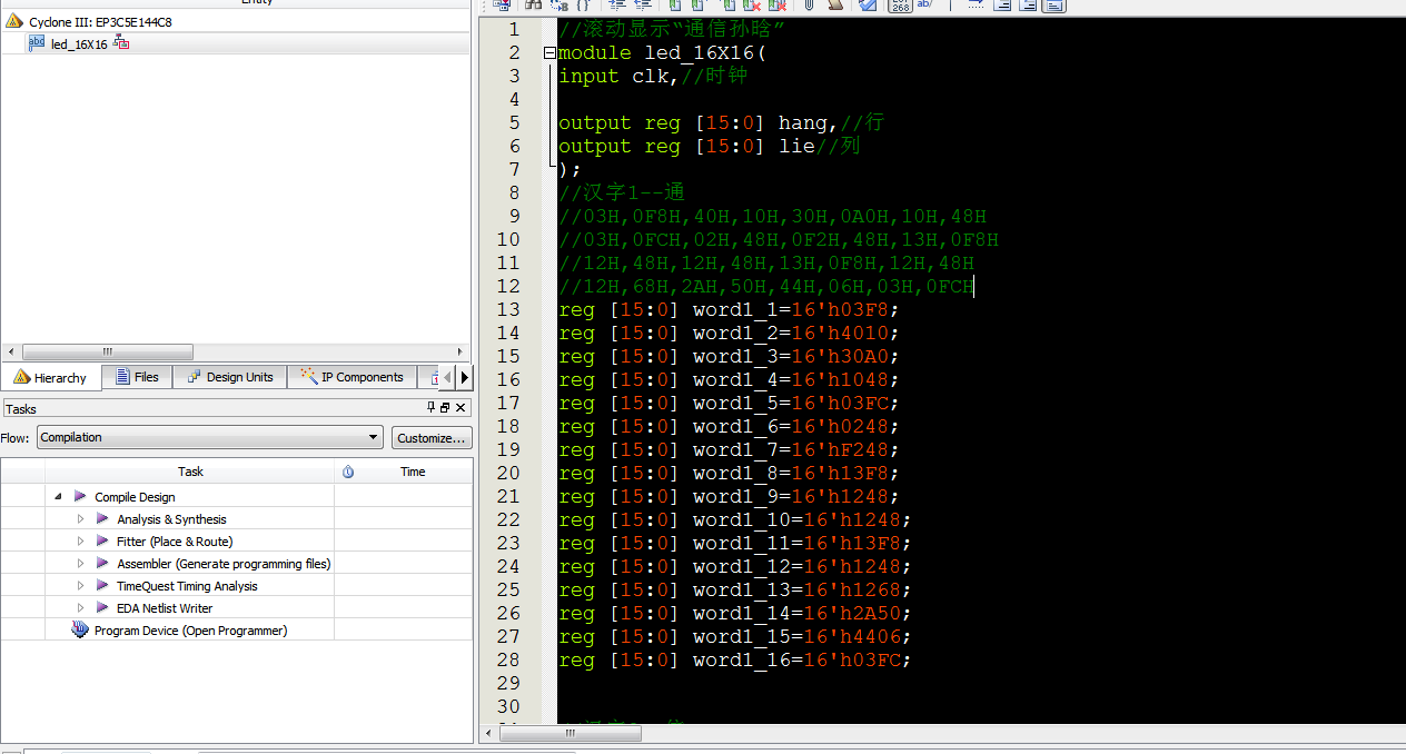 名称:汉字数字点阵显示设计Verilog代码Quartus仿真