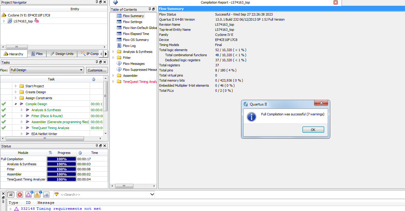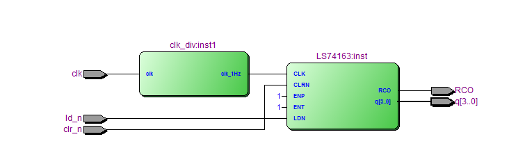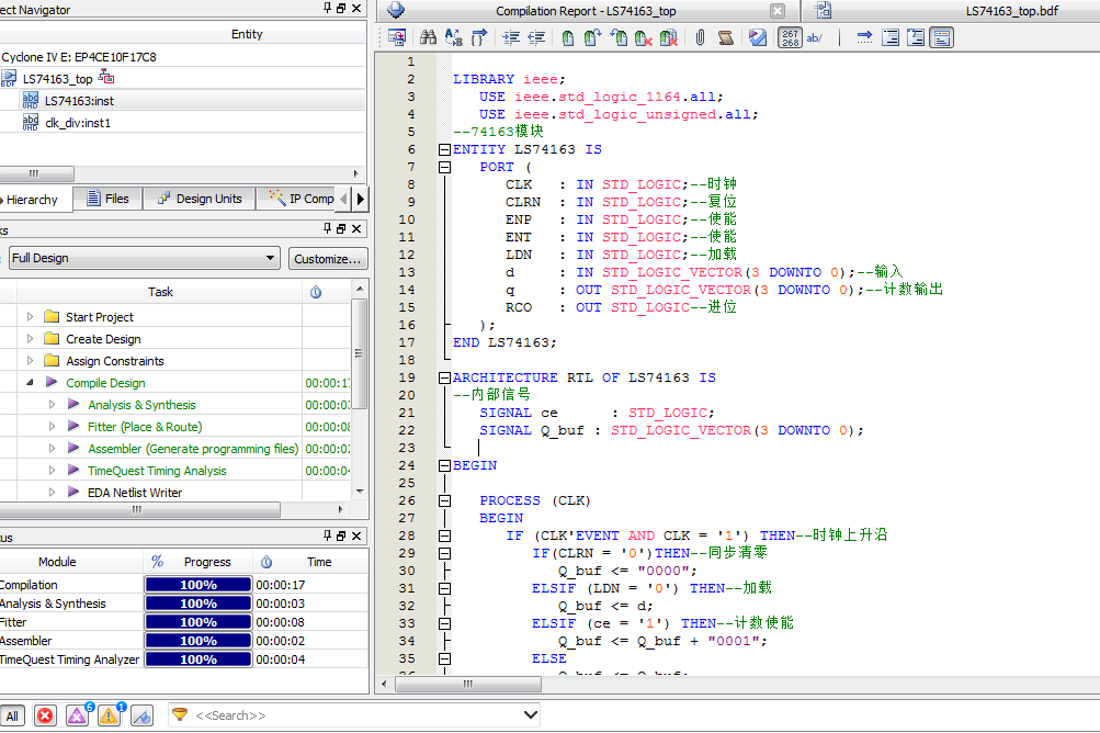 代码功能:使用quartus用vhdl语言设计一个4位二进制74163计数器