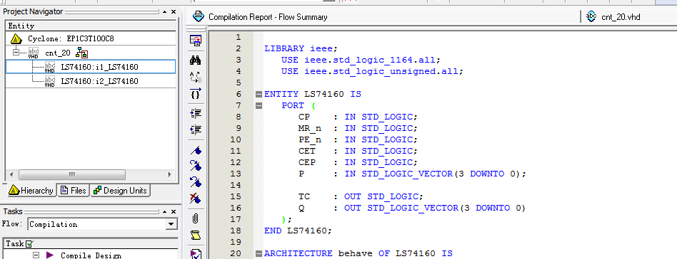 名称:基于74LS160芯片的20进制计数器VHDL代码Quartus仿真