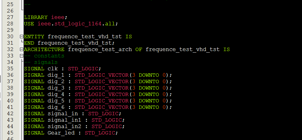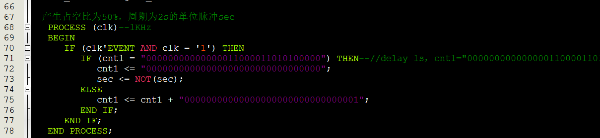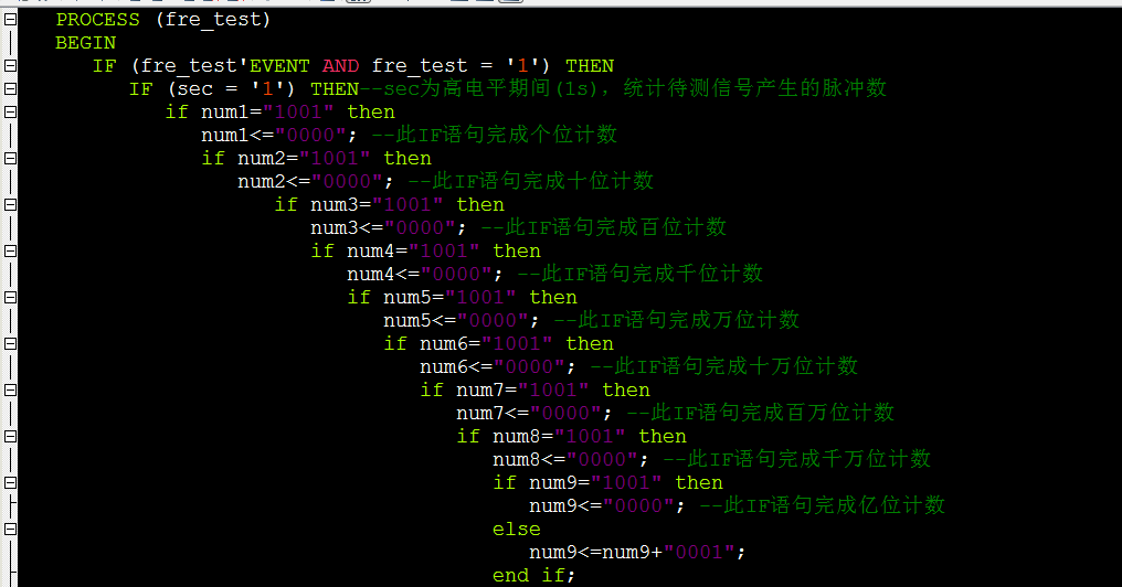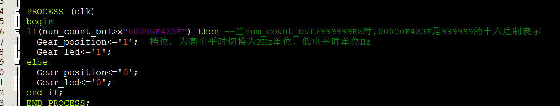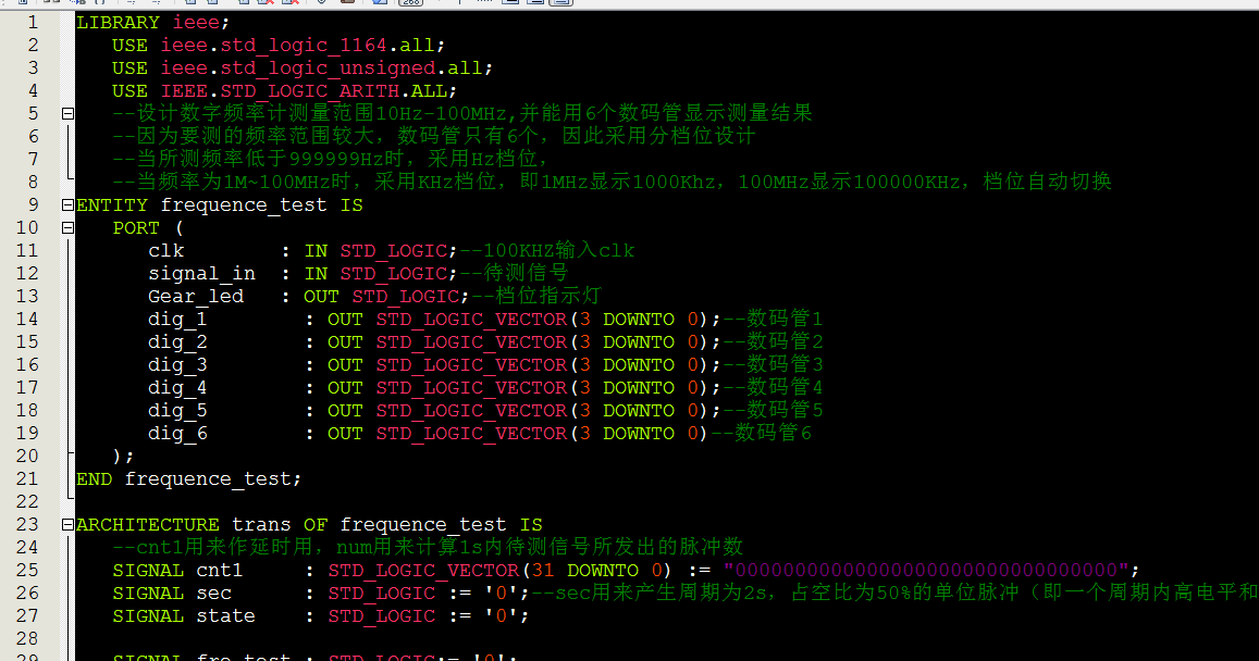 LIBRARY?ieee; ???USE?ieee.std_logic_1164.all; ???USE?ieee.std_logic_unsigned.all; USE?IEEE.STD_LOGIC_ARITH.ALL; --设计数字频率计测量范围10Hz-100MHz,并能用6个数码管显示测量结果 --因为要测的频率范围较大,数码管只有6个,因此采用分档位设计 --当所测频率低于999999Hz时,采用Hz档位, --当频率为1M~100MHz时,采用KHz档位,即1MHz显示1000Khz,100MHz显示100000KHz,档位自动切换 ENTITY?frequence_test?IS ???PORT?( ??????clk????????:?IN?STD_LOGIC;--100KHZ输入clk ??????signal_in??:?IN?STD_LOGIC;--待测信号 Gear_led???:?OUT?STD_LOGIC;--档位指示灯 ??????dig_1????????:?OUT?STD_LOGIC_VECTOR(3?DOWNTO?0);--数码管1 dig_2????????:?OUT?STD_LOGIC_VECTOR(3?DOWNTO?0);--数码管2 dig_3????????:?OUT?STD_LOGIC_VECTOR(3?DOWNTO?0);--数码管3 dig_4????????:?OUT?STD_LOGIC_VECTOR(3?DOWNTO?0);--数码管4 dig_5????????:?OUT?STD_LOGIC_VECTOR(3?DOWNTO?0);--数码管5 dig_6????????:?OUT?STD_LOGIC_VECTOR(3?DOWNTO?0)--数码管6 ???); END?frequence_test; ARCHITECTURE?trans?OF?frequence_test?IS ???--cnt1用来作延时用,num用来计算1s内待测信号所发出的脉冲数 ???SIGNAL?cnt1?????:?STD_LOGIC_VECTOR(31?DOWNTO?0)?:=?"00000000000000000000000000000000"; ???SIGNAL?sec??????:?STD_LOGIC?:=?'0';--sec用来产生周期为2s,占空比为50%的单位脉冲(即一个周期内高电平和低电平持续时间均为1s) ???SIGNAL?state????:?STD_LOGIC?:=?'0'; ??? ???SIGNAL?fre_test?:?STD_LOGIC:=?'0'; ??? ???SIGNAL?wei1?????:?STD_LOGIC_VECTOR(3?DOWNTO?0):=?"0000"; ???SIGNAL?wei2?????:?STD_LOGIC_VECTOR(3?DOWNTO?0):=?"0000"; ???SIGNAL?wei3?????:?STD_LOGIC_VECTOR(3?DOWNTO?0):=?"0000"; ???SIGNAL?wei4?????:?STD_LOGIC_VECTOR(3?DOWNTO?0):=?"0000"; ???SIGNAL?wei5?????:?STD_LOGIC_VECTOR(3?DOWNTO?0):=?"0000"; ???SIGNAL?wei6?????:?STD_LOGIC_VECTOR(3?DOWNTO?0):=?"0000"; ???SIGNAL?wei7?????:?STD_LOGIC_VECTOR(3?DOWNTO?0):=?"0000"; ???SIGNAL?wei8?????:?STD_LOGIC_VECTOR(3?DOWNTO?0):=?"0000"; ???SIGNAL?wei9?????:?STD_LOGIC_VECTOR(3?DOWNTO?0):=?"0000"; -- ???SIGNAL?num1?????:?STD_LOGIC_VECTOR(3?DOWNTO?0):=?"0000"; ???SIGNAL?num2?????:?STD_LOGIC_VECTOR(3?DOWNTO?0):=?"0000"; ???SIGNAL?num3?????:?STD_LOGIC_VECTOR(3?DOWNTO?0):=?"0000"; ???SIGNAL?num4?????:?STD_LOGIC_VECTOR(3?DOWNTO?0):=?"0000"; ???SIGNAL?num5?????:?STD_LOGIC_VECTOR(3?DOWNTO?0):=?"0000"; ???SIGNAL?num6?????:?STD_LOGIC_VECTOR(3?DOWNTO?0):=?"0000"; ???SIGNAL?num7?????:?STD_LOGIC_VECTOR(3?DOWNTO?0):=?"0000"; ???SIGNAL?num8?????:?STD_LOGIC_VECTOR(3?DOWNTO?0):=?"0000"; ???SIGNAL?num9?????:?STD_LOGIC_VECTOR(3?DOWNTO?0):=?"0000"; ??? ???SIGNAL?jishu????:?STD_LOGIC_VECTOR(15?DOWNTO?0):=?"0000000000000000";?? ???SIGNAL?tab??????:?STD_LOGIC_VECTOR(3?DOWNTO?0):=?"0000"; SIGNAL?Gear_position?:?STD_LOGIC:=?'0';--档位,为高电平时切换为KHz单位,低电平时单位Hz SIGNAL?num_count????:?STD_LOGIC_VECTOR(39?DOWNTO?0):=?x"0000000000"; SIGNAL?num_count_buf????:?STD_LOGIC_VECTOR(39?DOWNTO?0):=?x"0000000000"; ???SIGNAL?wei1_display?????:?STD_LOGIC_VECTOR(3?DOWNTO?0):=?"0000"; ???SIGNAL?wei2_display?????:?STD_LOGIC_VECTOR(3?DOWNTO?0):=?"0000"; ???SIGNAL?wei3_display?????:?STD_LOGIC_VECTOR(3?DOWNTO?0):=?"0000"; ???SIGNAL?wei4_display?????:?STD_LOGIC_VECTOR(3?DOWNTO?0):=?"0000"; ???SIGNAL?wei5_display?????:?STD_LOGIC_VECTOR(3?DOWNTO?0):=?"0000"; ???SIGNAL?wei6_display?????:?STD_LOGIC_VECTOR(3?DOWNTO?0):=?"0000"; BEGIN ???fre_test?<=?signal_in;