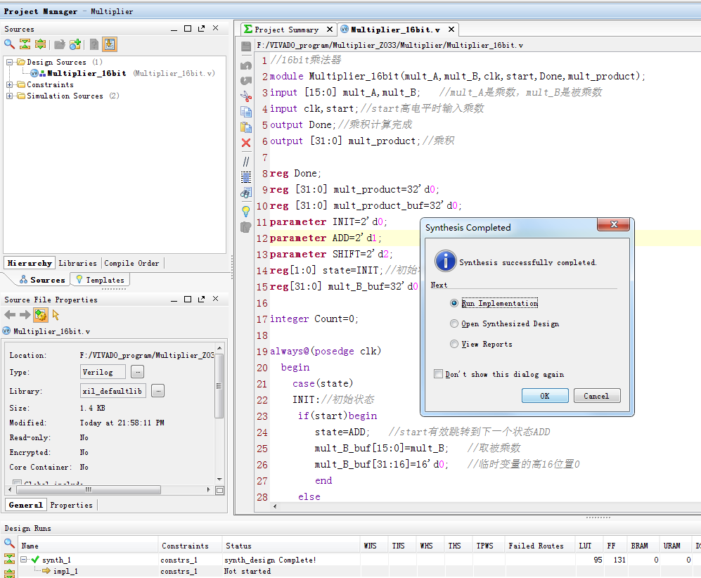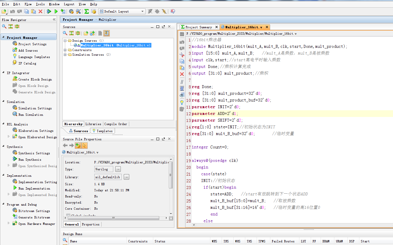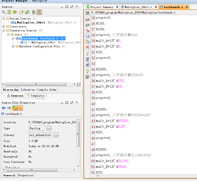 名称:16位乘法器设计Verilog代码VIVADO仿真