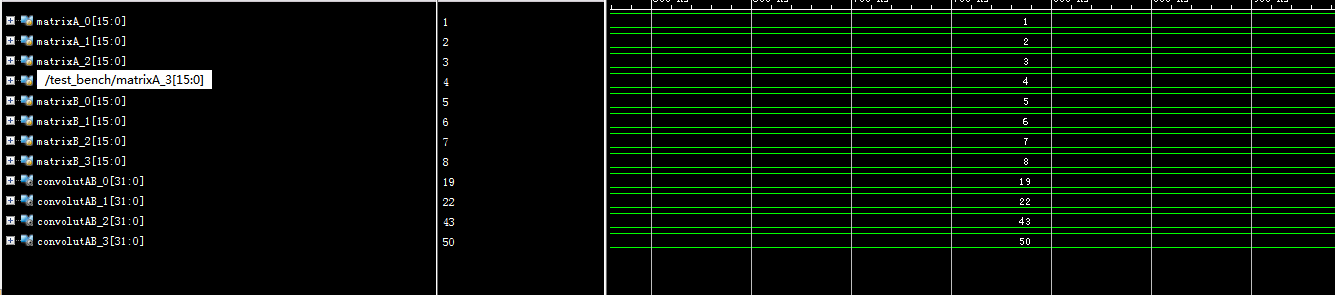 `timescale?1ns?/?1ps ////////////////////////////////////////////////////////////////////////////////// //?Company:? //?Engineer:? //? //?Create?Date:?2020/04/04?12:42:42 //?Design?Name:? //?Module?Name:?matrix_mul //?Project?Name:? //?Target?Devices:? //?Tool?Versions:? //?Description:? //? //?Dependencies:? //? //?Revision: //?Revision?0.01?-?File?Created //?Additional?Comments: //? ////////////////////////////////////////////////////////////////////////////////// module?matrix_mul( input?clk, input?[15:0]?matrixA_0,//输入矩阵A元素1 input?[15:0]?matrixA_1,//输入矩阵A元素2 input?[15:0]?matrixA_2,//输入矩阵A元素3 input?[15:0]?matrixA_3,//输入矩阵A元素4 input?[15:0]?matrixB_0,//输入矩阵B元素1 input?[15:0]?matrixB_1,//输入矩阵B元素2 input?[15:0]?matrixB_2,//输入矩阵B元素3 input?[15:0]?matrixB_3,//输入矩阵B元素4 output?[31:0]?convolutAB_0,//输出结果元素1 output?[31:0]?convolutAB_1,//输出结果元素2 output?[31:0]?convolutAB_2,//输出结果元素3 output?[31:0]?convolutAB_3//输出结果元素4 ); wire?[31:0]?matrixA_0XmatrixB_0; wire?[31:0]?matrixA_1XmatrixB_2; wire?[31:0]?matrixA_0XmatrixB_1; wire?[31:0]?matrixA_1XmatrixB_3; wire?[31:0]matrixA_2XmatrixB_0; wire?[31:0]matrixA_3XmatrixB_2; wire?[31:0]matrixA_2XmatrixB_1; wire?[31:0]matrixA_3XmatrixB_3; //计算结果 assign?convolutAB_0=matrixA_0XmatrixB_0+matrixA_1XmatrixB_2; assign?convolutAB_1=matrixA_0XmatrixB_1+matrixA_1XmatrixB_3; assign?convolutAB_2=matrixA_2XmatrixB_0+matrixA_3XmatrixB_2; assign?convolutAB_3=matrixA_2XmatrixB_1+matrixA_3XmatrixB_3; mult_IP?I0?( ??.CLK(clk),??//?input?wire?CLK ??.A(matrixA_0),??????//?input?wire?[15?:?0]?A ??.B(matrixB_0),??????//?input?wire?[15?:?0]?B ??.P(matrixA_0XmatrixB_0)??????//?output?wire?[31?:?0]?P ); mult_IP?I1?( ??.CLK(clk),??//?input?wire?CLK ??.A(matrixA_1),??????//?input?wire?[15?:?0]?A ??.B(matrixB_2),??????//?input?wire?[15?:?0]?B ??.P(matrixA_1XmatrixB_2)??????//?output?wire?[31?:?0]?P ); mult_IP?I2?( ??.CLK(clk),??//?input?wire?CLK ??.A(matrixA_0),??????//?input?wire?[15?:?0]?A ??.B(matrixB_1),??????//?input?wire?[15?:?0]?B ??.P(matrixA_0XmatrixB_1)??????//?output?wire?[31?:?0]?P ); mult_IP?I3?( ??.CLK(clk),??//?input?wire?CLK ??.A(matrixA_1),