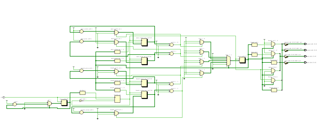 /* 红->绿?绿->黄?黄->红 1、红--计时main_red_times------------------------绿--计时main_green_times---main_yellow_times黄灯---------------红 2、绿--计时branch_green_times---branch_yellow_times黄灯--------------------红--计时branch_reg_times-------------------绿 */ //设路口A为主路,路口B为支路 module?traffic_light( input?clk,//时钟 //4组路灯,led?1亮0灭 output?[2:0]main_LED_1,//主路灯1 output?[2:0]main_LED_2,//主路灯2 output?[2:0]branch_LED_1,//支路灯1 output?[2:0]branch_LED_2//支路灯2 ); wire?clk_1Hz; reg?main_red;//主路灯 reg?main_green;//主路灯 reg?main_yellow;//主路灯 reg?branch_red;//支路灯 reg?branch_green;//支路灯 reg?branch_yellow;//支路灯 //led?1亮0灭 assign?main_LED_1[0]=main_red;//主路灯 assign?main_LED_1[1]=main_green;//主路灯 assign?main_LED_1[2]=main_yellow?;//主路灯 assign?main_LED_2[0]=main_red;//主路灯 assign?main_LED_2[1]=main_green;//主路灯 assign?main_LED_2[2]=main_yellow?;//主路灯 assign?branch_LED_1[0]=branch_red;//支路灯 assign?branch_LED_1[1]=branch_green;//支路灯 assign?branch_LED_1[2]=branch_yellow?;//支路灯? assign?branch_LED_2[0]=branch_red;//支路灯 assign?branch_LED_2[1]=branch_green;//支路灯 assign?branch_LED_2[2]=branch_yellow?;//支路灯? //分频模块 //分频到1Hz reg?[31:0]?cnt='d0; reg?clk_1hz=0; assign?clk_1Hz=clk_1hz; always@(posedge?clk)//分频 if(cnt==32'd250)?begin//分频500,得1HZ,250 cnt<=32'd0; clk_1hz<=~clk_1hz; end else?begin ???cnt<=cnt+32'd1; clk_1hz<=clk_1hz; end