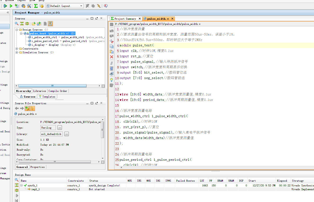 名称:脉冲信号周期和脉冲宽度测量设计Verilog代码VIVADO仿真