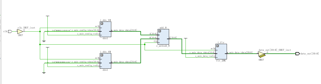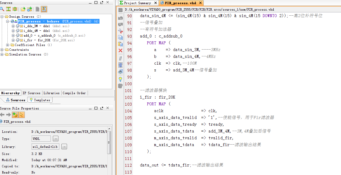 信号输入:正弦信号1、2的混频:信号1频率:4MHz,信号2频率:3MHz;采样频率:100MHz,采样点数:4096。fdatool设计低通滤波器(等波纹法设计,最小阶),生成coe文件,vivado导入coe文件,完成FIR ip核的设计,顶层和tb文件的编写,引入信号,实现滤波。