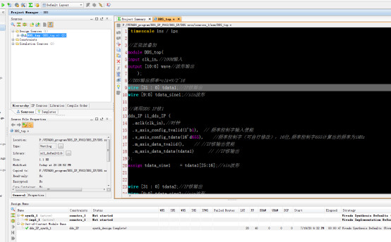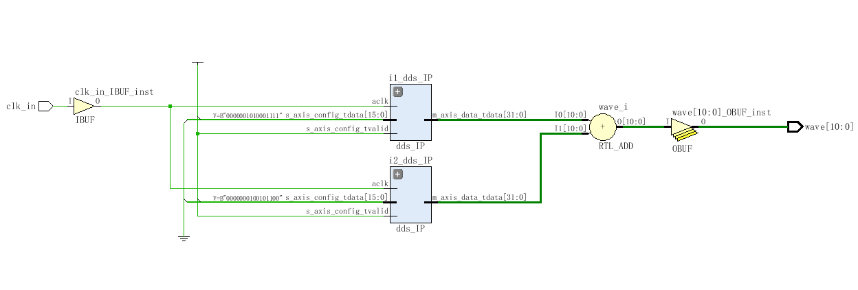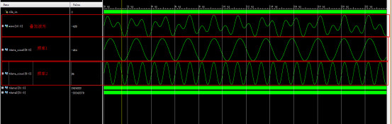 代码功能:基于DDS的IP核,设计产生2路正弦波,并将2路正弦波叠加,输出叠加后波形