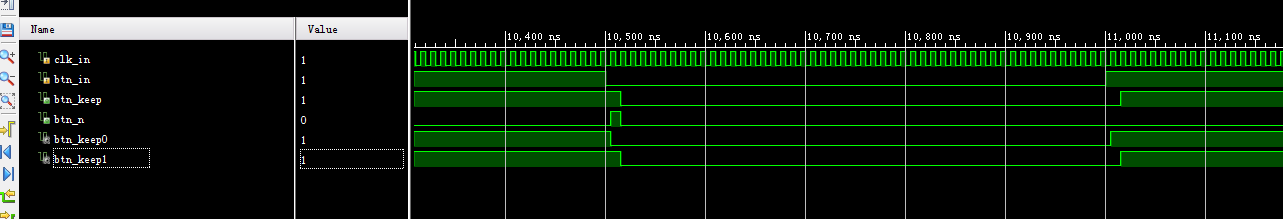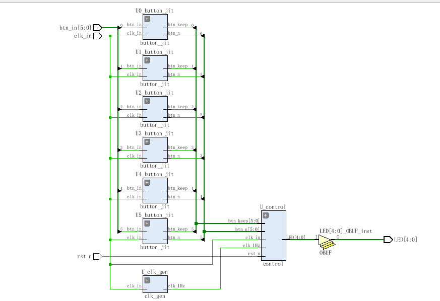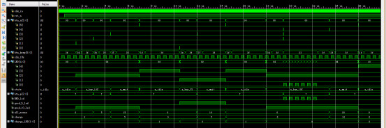 library?IEEE; use?IEEE.STD_LOGIC_1164.ALL; --顶层模块 entity?top?is ????port ( clk?:in??std_logic;--clk rst_n?:in??std_logic;--复位 btn_in?:in??std_logic_vector(5?downto?0);--btn_n(0)5元饮料,btn_n(1)10元饮料,btn_n(2)5元,btn_n(3)10元,btn_n(4)20元,btn_n(5)饮料推出 LED?:out?std_logic_vector(4?downto?0)?--LED(0)红灯闪烁,LED(1)售卖5元指示灯,LED(2)售卖10元指示灯,LED(3)5元找零信号,LED(4)10元找零信号 ); end?top; architecture?Behavioral?of?top?is --分频模块 component?clk_gen?is port ( clk_in?:in??std_logic;--clk_in?50MHz clk_1Hz??:out?std_logic?--1Hz信号输出 ); end?component; --按键下降沿检测 component?button_jit?is port ( clk_in???:in??std_logic;--clk_in btn_in?????:in??std_logic;--按键信号输入 btn_keep?:out?std_logic;?--按键值输出 btn_n??:out?std_logic?--按键标志信号输出 ); end?component; --控制模块 entity?control?is ????port ( clk_in???:in??std_logic;--clk_in rst_n???:in??std_logic;--rst低有效 btn_n??:in??std_logic_vector(5?downto?0);--btn_n(0)5元饮料,btn_n(1)10元饮料,btn_n(2)5元,btn_n(3)10元,btn_n(4)20元,btn_n(5)检测饮料推出 btn_keep?:in??std_logic_vector(5?downto?0);--按键值信号输入 clk_1Hz???:in??std_logic;--1Hz时钟输入 LED???????:out?std_logic_vector(4?downto?0)--LED(0)红灯闪烁,LED(1)售卖5元指示灯,LED(2)售卖10元指示灯,LED(3)5元找零信号,LED(4)10元找零信号 ); end?control; ???? ????signal?clk_1Hz:std_logic; signal?clk_in:std_logic; ????signal?btn_n:?std_logic_vector(5?downto?0); signal?btn_keep:?std_logic_vector(5?downto?0); begin --分频模块 U_clk_gen:?clk_gen port?map ( clk_in?=>?clk_in,--clk?50MHz clk_1Hz?=>?clk_1Hz?--1Hz信号输出 ); --按键下降沿检测 U0_button_jit?button_jit port?map ( clk_in=>?clk_in,--clk_in btn_in=>?btn_in(0),--按键信号输入 btn_keep=>?btn_keep(0),?--按键值输出 btn_n=>?btn_n(0)?--按键标志信号输出 ); --按键下降沿检测 U1_button_jit?button_jit port?map ( clk_in=>?clk_in,--clk_in btn_in=>?btn_in(1),--按键信号输入 btn_keep=>?btn_keep(1),?--按键值输出 btn_n=>?btn_n(1)?--按键标志信号输出 ); --按键下降沿检测 U2_button_jit?button_jit port?map ( clk_in=>?clk_in,--clk_in btn_in=>?btn_in(2),--按键信号输入 btn_keep=>?btn_keep(2),?--按键值输出 btn_n=>?btn_n(2)?--按键标志信号输出 ); --按键下降沿检测 U3_button_jit?button_jit port?map ( clk_in=>?clk_in,--clk_in btn_in=>?btn_in(3),--按键信号输入 btn_keep=>?btn_keep(3),?--按键值输出 btn_n=>?btn_n(3)?--按键标志信号输出 ); --按键下降沿检测 U4_button_jit?button_jit port?map ( clk_in=>?clk_in,--clk_in btn_in=>?btn_in(4),--按键信号输入 btn_keep=>?btn_keep(4),?--按键值输出 btn_n=>?btn_n(4)?--按键标志信号输出 );