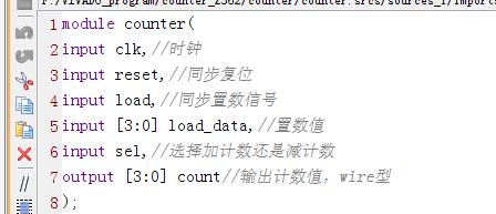 module?counter( input?clk,//时钟 input?reset,//同步复位 input?load,//同步置数信号 input?[3:0]?load_data,//置数值 input?sel,//选择加计数还是减计数 output?[3:0]?count//输出计数值,wire型 ); reg?[3:0]?cnt=4'd0; always@(posedge?clk) if(reset==1)//同步清零 cnt<=4'd0; else if(load==1)//同步置数信号 cnt<=load_data;//输入置数值 else if(sel==1)//为1表示加计数 if(cnt==4'd15)//最大值 cnt<=4'd15; else cnt<=cnt+4'd1;//加计数 else//为0表示减计数 if(cnt==4'd0)//为0 cnt<=4'd0;