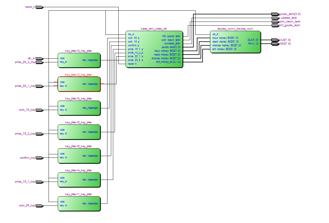 module?auto_sell( input?clk_in,//48M input?reset_n,//复位 //按键按下低电平 input?coin_10_key,//投币1元 input?coin_05_key,//投币0.5元 input?price_20_1_key,//2元商品1 input?price_20_2_key,//2元商品2 input?price_15_1_key,//1.5元商品1 input?price_15_2_key,//1.5元商品2 input?confirm_key,//确认 output?succeed_ledn,//购买成功指示灯 output?coin_return_ledn,//退币指示灯 output?[3:0]?goods_ledn,//商品指示灯 output?NO_goods_ledn,//商品缺货指示灯 output?[7:0]?DLA,//数码管位选,低电平选择 output?[7:0]?HEX//数码管段选,低亮 ); wire?[7:0]?input_money_BCD;//投币金额 wire?[7:0]?need_money_BCD;//价钱 wire?[7:0]?change_money_BCD;//找钱 wire?[7:0]?left_money_BCD;//还差金额 wire?coin_10_p;//投币1元 wire?coin_05_p;//投币0.5元 wire?price_20_1_p;//2元商品 wire?price_20_2_p;//2元商品 wire?price_15_1_p;//1.5元商品 wire?price_15_2_p;//1.5元商品 wire?confirm_p;//确认? //按键消抖模块 key_jitter?i0_key_jitter( .?clkin(clk_in),????? .?key_in(coin_10_key),//输入 .?key_negedge(coin_10_p)//消抖后按键下降沿 ); //按键消抖模块 key_jitter?i1_key_jitter( .?clkin(clk_in),????? .?key_in(coin_05_key),//输入 .?key_negedge(coin_05_p)//消抖后按键下降沿 ); //按键消抖模块 key_jitter?i2_key_jitter( .?clkin(clk_in),????? .?key_in(price_20_1_key),//输入 .?key_negedge(price_20_1_p)//消抖后按键下降沿 ); //按键消抖模块 key_jitter?i3_key_jitter( .?clkin(clk_in),????? .?key_in(price_20_2_key),//输入 .?key_negedge(price_20_2_p)//消抖后按键下降沿 ); //按键消抖模块 key_jitter?i4_key_jitter( .?clkin(clk_in),????? .?key_in(price_15_1_key),//输入 .?key_negedge(price_15_1_p)//消抖后按键下降沿 );