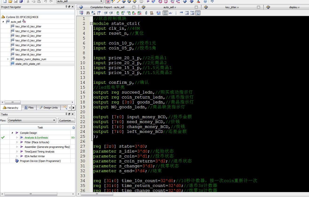 名称:基于FPGA的货物自动售货机设计Verilog代码Quartus仿真