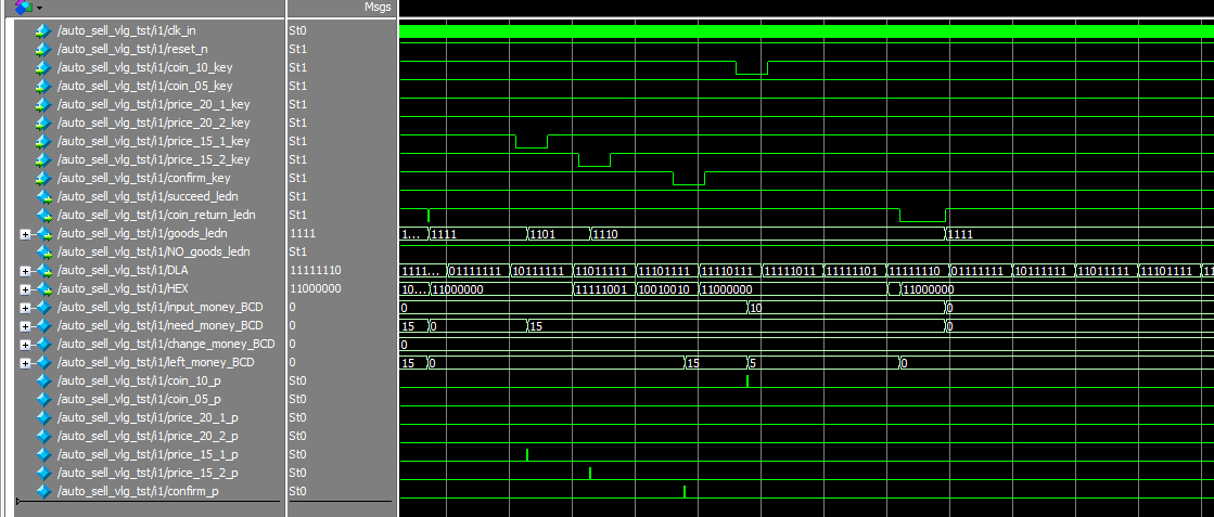 正常购买流程:选择2.0元商品,goods_led低电平亮,指示商品,按下确认键confirm_key后,先后投币1元,0.5元,1元,有显示投币金额input_money_BCD,价钱need_money_BCD,找钱change_money_BCD,还差金额left_money_BCD。