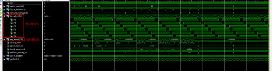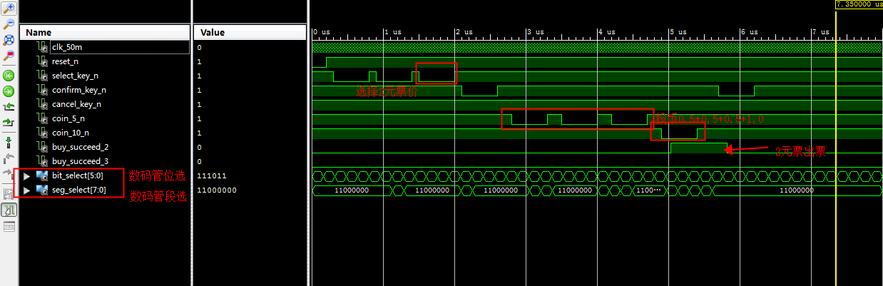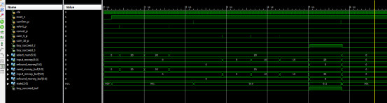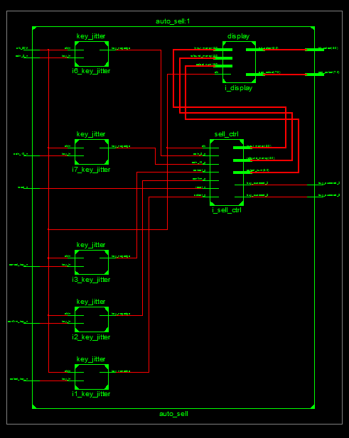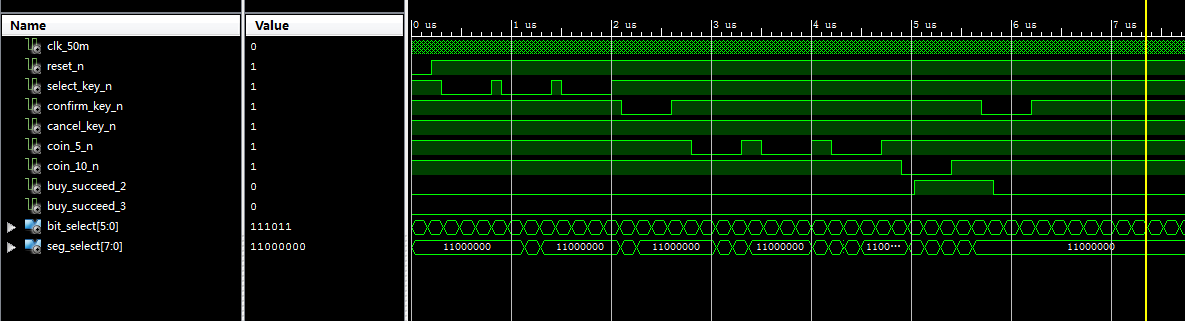LIBRARY?ieee; ???USE?ieee.std_logic_1164.all; ENTITY?auto_sell?IS ???PORT?( ??????clk_50M????????:?IN?STD_LOGIC;--50M时钟 ??????reset_n????????:?IN?STD_LOGIC;--复位,低电平表示按下 ?????? ??????select_key_n???:?IN?STD_LOGIC;--票价选择按键,低电平表示按下 ??????confirm_key_n??:?IN?STD_LOGIC;--确认按键,低电平表示按下 ??????cancel_key_n???:?IN?STD_LOGIC;--取消按键,低电平表示按下 ??????coin_5_n???????:?IN?STD_LOGIC;--投币0.5元,低电平表示按下 coin_10_n???????:?IN?STD_LOGIC;--投币1元,低电平表示按下 ?????? ??????buy_succeed_2????:?OUT?STD_LOGIC;--出票指示灯2元,高电平有效 buy_succeed_3????:?OUT?STD_LOGIC;--出票指示灯3元,高电平有效 ??????bit_select?????:?OUT?STD_LOGIC_VECTOR(5?DOWNTO?0);--数码管位选 ??????seg_select?????:?OUT?STD_LOGIC_VECTOR(7?DOWNTO?0)--数码管段选 ???); END?auto_sell; ARCHITECTURE?trans?OF?auto_sell?IS --售货控制模块 component?sell_ctrl?IS ???PORT?( ??????clk????????????:?IN?STD_LOGIC; ??????reset_n????????:?IN?STD_LOGIC; ?????? ??????confirm_p??????:?IN?STD_LOGIC; ??????select_p???????:?IN?STD_LOGIC; ??????concel_p???????:?IN?STD_LOGIC; ??????coin_5_p???????:?IN?STD_LOGIC; coin_10_p???????:?IN?STD_LOGIC;--投币1.0元 ?????? ??????buy_succeed_2????:?OUT?STD_LOGIC;--出票指示灯2元 buy_succeed_3????:?OUT?STD_LOGIC;--出票指示灯3元 ??????select_num?????:?OUT?STD_LOGIC_VECTOR(5?DOWNTO?0); ??????input_money????:?OUT?STD_LOGIC_VECTOR(5?DOWNTO?0); ??????refound_money??:?OUT?STD_LOGIC_VECTOR(5?DOWNTO?0) ???); END?component; --按键消抖模块 component?key_jitter?IS ???PORT?( ??????clkin????????:?IN?STD_LOGIC; ??????key_in???????:?IN?STD_LOGIC; ??????key_negedge??:?OUT?STD_LOGIC ???); END?component; --显示模块 component?display?IS ???PORT?( ??????clk????????????:?IN?STD_LOGIC; ?????? ??????select_num?????:?IN?STD_LOGIC_VECTOR(5?DOWNTO?0); ??????input_money????:?IN?STD_LOGIC_VECTOR(5?DOWNTO?0); ??????refound_money??:?IN?STD_LOGIC_VECTOR(5?DOWNTO?0); ?????? ??????bit_select?????:?OUT?STD_LOGIC_VECTOR(5?DOWNTO?0); ??????seg_select?????:?OUT?STD_LOGIC_VECTOR(7?DOWNTO?0) ???); END?component; ???SIGNAL?select_num????????:?STD_LOGIC_VECTOR(5?DOWNTO?0); ???SIGNAL?input_money???????:?STD_LOGIC_VECTOR(5?DOWNTO?0); ???SIGNAL?refound_money?????:?STD_LOGIC_VECTOR(5?DOWNTO?0); ??? ???SIGNAL?confirm_p?????????:?STD_LOGIC; ???SIGNAL?select_p??????????:?STD_LOGIC; ???SIGNAL?concel_p??????????:?STD_LOGIC; ???SIGNAL?coin_5_p??????????:?STD_LOGIC; SIGNAL?coin_10_p??????????:?STD_LOGIC; ??? ???--?Declare?intermediate?signals?for?referenced?outputs ???SIGNAL?buy_succeed_buf?:?STD_LOGIC; ???SIGNAL?bit_select_buf??:?STD_LOGIC_VECTOR(5?DOWNTO?0); ???SIGNAL?seg_select_buf??:?STD_LOGIC_VECTOR(7?DOWNTO?0); BEGIN ???bit_select?<=?bit_select_buf; ???seg_select?<=?seg_select_buf; --调用按键消抖模块??? ???i1_key_jitter?:?key_jitter ??????PORT?MAP?( ?????????clkin????????=>?clk_50M, ?????????key_in???????=>?select_key_n, ?????????key_negedge??=>?select_p ??????); ??? ??? --调用按键消抖模块??? ???i2_key_jitter?:?key_jitter ??????PORT?MAP?( ?????????clkin????????=>?clk_50M, ?????????key_in???????=>?confirm_key_n, ?????????key_negedge??=>?confirm_p ??????); ??? ??? --调用按键消抖模块??? ???i3_key_jitter?:?key_jitter ??????PORT?MAP?( ?????????clkin????????=>?clk_50M, ?????????key_in???????=>?cancel_key_n, ?????????key_negedge??=>?concel_p ??????); ??? ??? --调用按键消抖模块??? ???i6_key_jitter?:?key_jitter ??????PORT?MAP?( ?????????clkin????????=>?clk_50M, ?????????key_in???????=>?coin_5_n, ?????????key_negedge??=>?coin_5_p ??????); --调用按键消抖模块??? ???i7_key_jitter?:?key_jitter ??????PORT?MAP?( ?????????clkin????????=>?clk_50M, ?????????key_in???????=>?coin_10_n, ?????????key_negedge??=>?coin_10_p ??????);