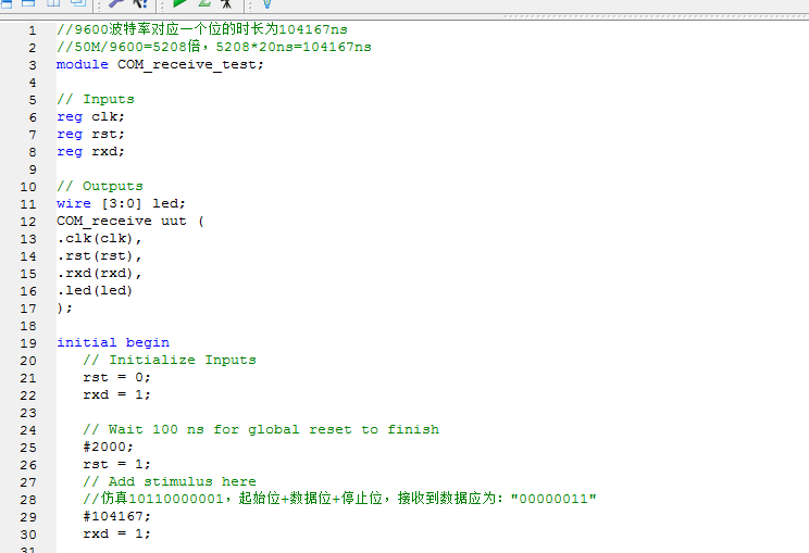 module?baudrate_set( input??clk,//50M output?reg?clkbaud8x//clkbaud8x为8倍波特率 ); //波特率设置模块,以下为9600波特率的设置值。50M除以波特率的8倍 parameter?div_cnt?=?650;//50000000?/?(9600?*?8); reg?[31:0]?count?=?0; always?@(posedge?clk)?begin if?(count?==?div_cnt) count?<=?0; else count?<=?count?+?32'b1; end always?@(posedge?clk) if(count==32'd0) clkbaud8x<=1; else clkbaud8x<=0; endmodule