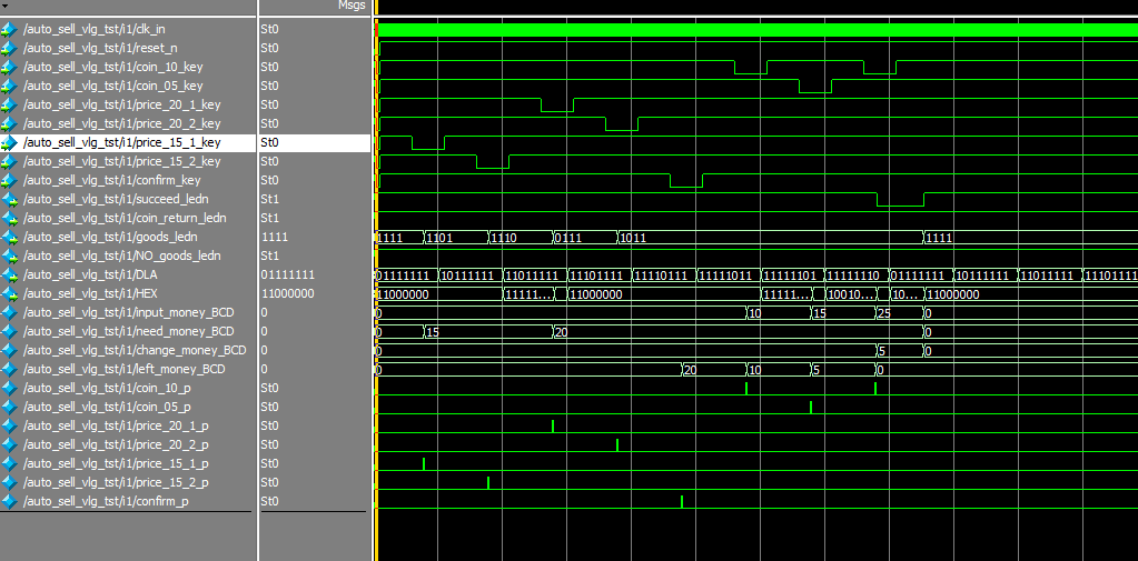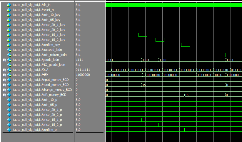 正常购买流程:选择2.0元商品,goods_led低电平亮,指示商品,按下确认键confirm_key后,先后投币1元,0.5元,1元,有显示投币金额input_money_BCD,价钱need_money_BCD,找钱change_money_BCD,还差金额left_money_BCD。