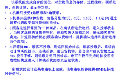 该系统能完成自身的复位。对货物信息的存储、进程控制,硬币处理、余额计算、显示等功能。