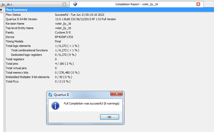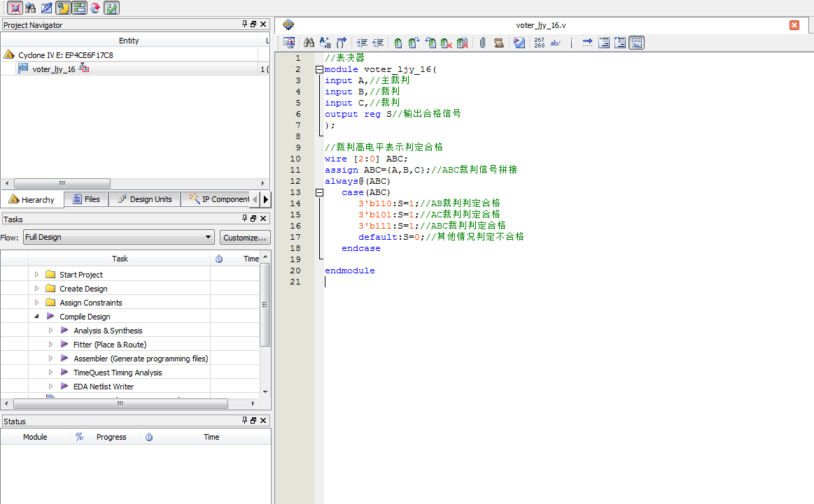 名称:基于FPGA的表决器和计数器Verilog代码Quartus仿真