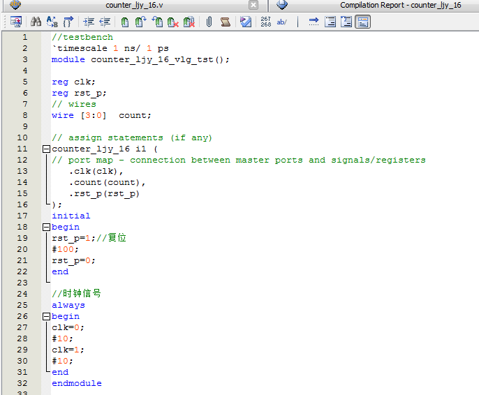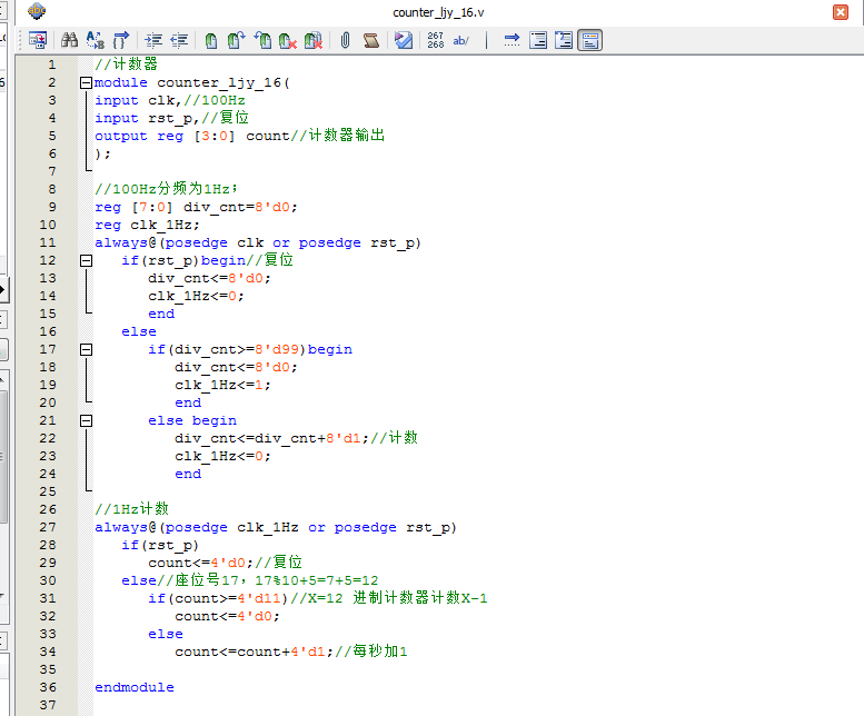 //计数器 module?counter_ljy_16( input?clk,//100Hz input?rst_p,//复位 output?reg?[3:0]?count//计数器输出 ); //100Hz分频为1Hz; reg?[7:0]?div_cnt=8'd0; reg?clk_1Hz; always@(posedge?clk?or?posedge?rst_p) if(rst_p)begin//复位 div_cnt<=8'd0; clk_1Hz<=0; end else if(div_cnt>=8'd99)begin div_cnt<=8'd0; clk_1Hz<=1; end else?begin div_cnt<=div_cnt+8'd1;//计数 clk_1Hz<=0; end