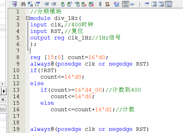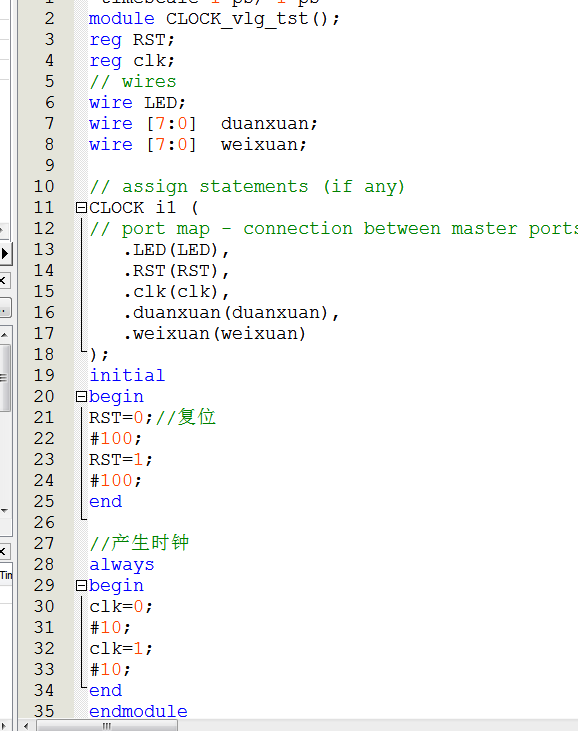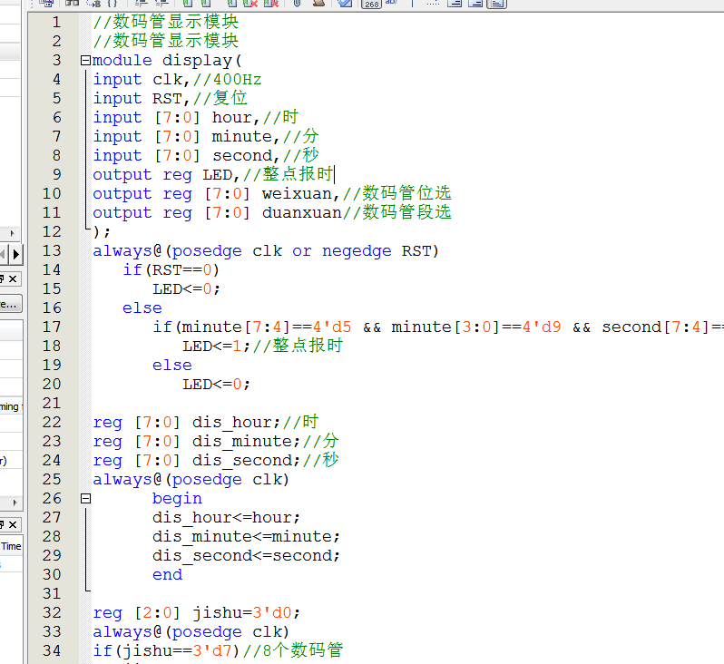 module?CLOCK( input?clk,//400HZ input?RST,//复位 output?LED,//整点报时 output?[7:0]?weixuan,//数码管位选 output?[7:0]?duanxuan//数码管段选 ); wire?[7:0]?hour;//时 wire?[7:0]?minute;//分 wire?[7:0]?second;//秒 wire?clk_1Hz; //分频模块 div_1Hz?i_div_1Hz( .?clk(clk),//400HZ .?RST(RST),//复位 .?clk_1Hz(clk_1Hz) ); //计时模块 timmer?i_timmer( .?clk(clk), .?clk_1Hz(clk_1Hz), .?RST(RST),//复位 .?hour_out(hour),//时 .?minute_out(minute),//分 .?second_out(second)//秒 ); //数码管显示模块 display?i_display( .?clk(clk),//400HZ .?RST(RST),//复位 .?hour(hour),//时 .?minute(minute),//分 .?second(second),//秒 .?LED(LED), .?weixuan(weixuan),//数码管位选 .?duanxuan(duanxuan)//数码管段选 ); endmodule