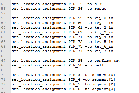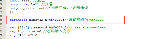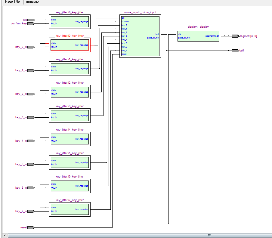module?mimasuo( input?clk,//时钟 input?reset,//复位,按下低电平 input?key_0_in,//数字按键0~7 input?key_1_in,//数字按键0~7 input?key_2_in,//数字按键0~7 input?key_3_in,//数字按键0~7 input?key_4_in,//数字按键0~7 input?key_5_in,//数字按键0~7 input?key_6_in,//数字按键0~7 input?key_7_in,//数字按键0~7 input?confirm_key,//确认按键,代表密码输入完成,按下低电平 output?bell,//报警 //结果在数码管中显示 output?[3:0]?segment//数码管 ); wire?key_0; wire?key_1; wire?key_2; wire?key_3; wire?key_4; wire?key_5; wire?key_6; wire?key_7; wire?confirm; wire?pass_or_not;//1表示正确,0表示错误 //输入按键消抖 key_jitter?i0_key_jitter( .?clkin(clk),????? .?key_in(key_0_in),//输入 .?key_negedge(key_0)//消抖后按键 ); key_jitter?i1_key_jitter( .?clkin(clk),????? .?key_in(key_1_in),//输入 .?key_negedge(key_1)//消抖后按键 ); key_jitter?i2_key_jitter( .?clkin(clk),????? .?key_in(key_2_in),//输入 .?key_negedge(key_2)//消抖后按键 ); key_jitter?i3_key_jitter( .?clkin(clk),????? .?key_in(key_3_in),//输入 .?key_negedge(key_3)//消抖后按键 ); key_jitter?i4_key_jitter( .?clkin(clk),????? .?key_in(key_4_in),//输入 .?key_negedge(key_4)//消抖后按键 ); key_jitter?i5_key_jitter( .?clkin(clk),????? .?key_in(key_5_in),//输入 .?key_negedge(key_5)//消抖后按键 ); key_jitter?i6_key_jitter( .?clkin(clk),????? .?key_in(key_6_in),//输入 .?key_negedge(key_6)//消抖后按键 );