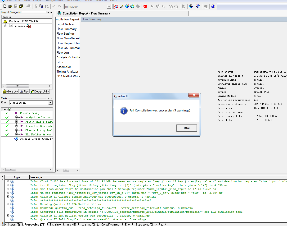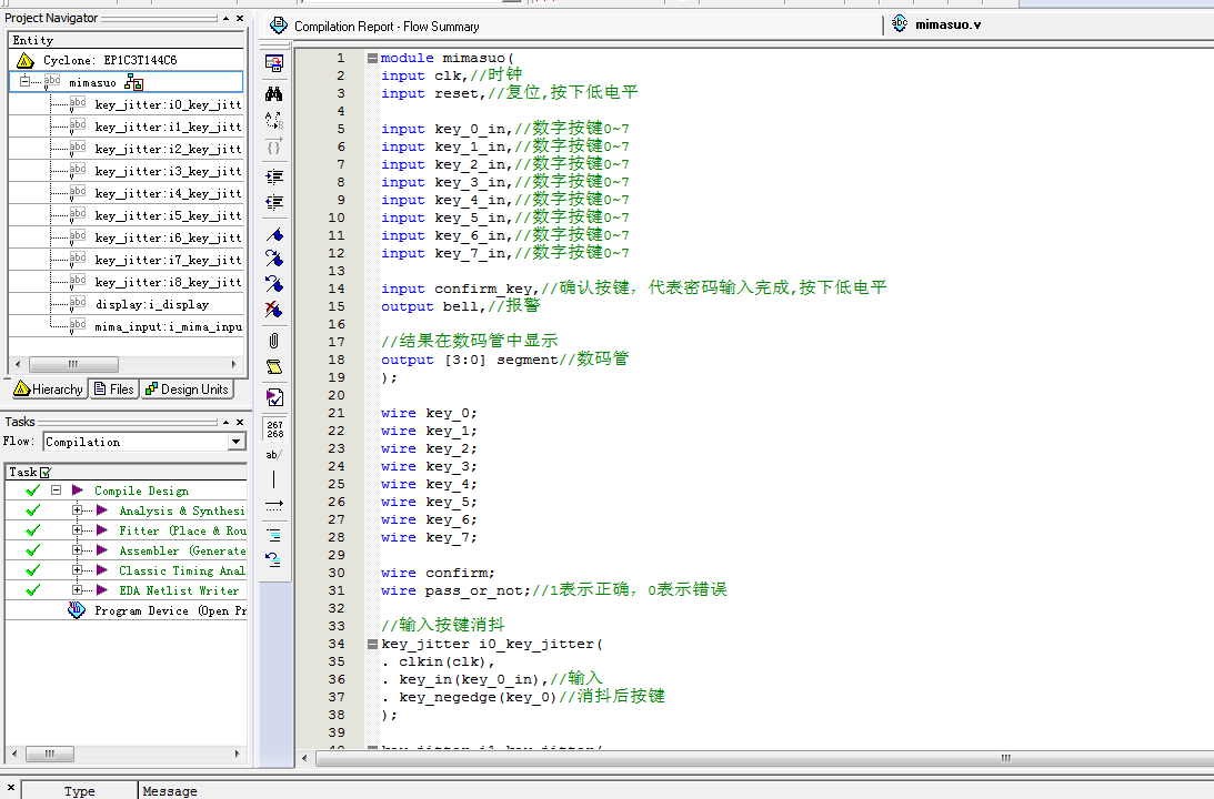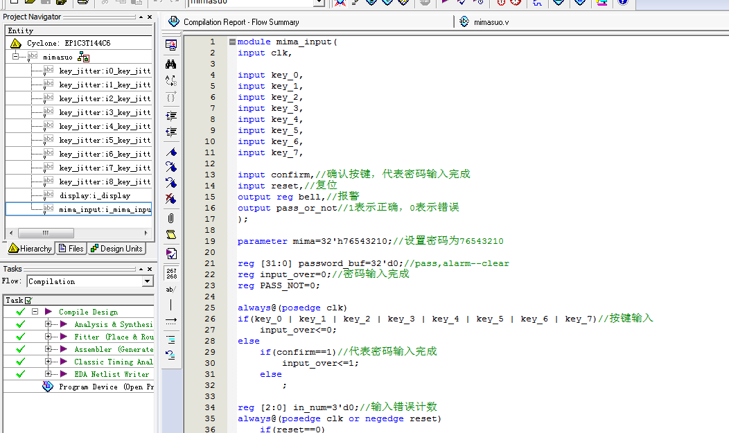 名称:基于FPGA的数字密码锁电路Verilog代码Quartus仿真