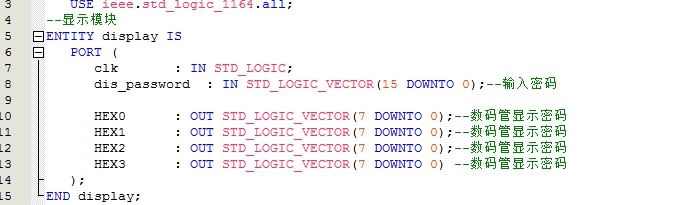 LIBRARY?ieee; ???USE?ieee.std_logic_1164.all; ???USE?ieee.std_logic_unsigned.all; --密码锁控制模块 ENTITY?mimasuo_ctrl?IS ???PORT?( ??????clk???????????????:?IN?STD_LOGIC; ??????password??????????:?IN?STD_LOGIC_VECTOR(15?DOWNTO?0);--输入密码 ??????current_num???????:?IN?STD_LOGIC_VECTOR(2?DOWNTO?0);--当前输入密码个数 ??dis_password??????:?OUT?STD_LOGIC_VECTOR(15?DOWNTO?0);--密码输出到数码管 ??????led_open??????????:?OUT?STD_LOGIC--开锁指示灯 ???); END?mimasuo_ctrl; ARCHITECTURE?trans?OF?mimasuo_ctrl?IS ???SIGNAL??correct_password??:?STD_LOGIC_VECTOR(15?DOWNTO?0):=x"1234";--预设正确密码为1234?? ???SIGNAL??in_password??:?STD_LOGIC_VECTOR(15?DOWNTO?0):=x"0000";--输入最终密码 ???SIGNAL?led_open_buf?:?STD_LOGIC?:=?'0'; BEGIN ???PROCESS?(clk) ???BEGIN ??????IF?(clk'EVENT?AND?clk?=?'1')?THEN??? IF(current_num<="100")THEN--输入4个数字 in_password<=password;--输入最终密码 END?IF; ??????END?IF; ???END?PROCESS; ??? ???dis_password<=in_password;