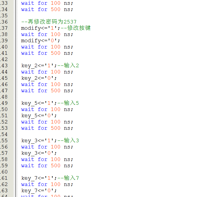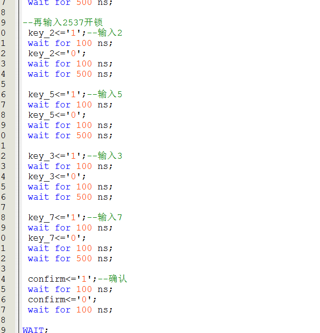 LIBRARY?ieee; ???USE?ieee.std_logic_1164.all; ???USE?ieee.std_logic_unsigned.all; --密码输入模块 ENTITY?mima_input?IS ???PORT?( ??????clk????????????:?IN?STD_LOGIC; ?????? ??????key_0??????????:?IN?STD_LOGIC;--按键0 ??????key_1??????????:?IN?STD_LOGIC;--按键1 ??????key_2??????????:?IN?STD_LOGIC;--按键2 ??????key_3??????????:?IN?STD_LOGIC;--按键3 ??????key_4??????????:?IN?STD_LOGIC;--按键4 ??????key_5??????????:?IN?STD_LOGIC;--按键5 ??????key_6??????????:?IN?STD_LOGIC;--按键6 ??????key_7??????????:?IN?STD_LOGIC;--按键7 ??????key_8??????????:?IN?STD_LOGIC;--按键8 ??????key_9??????????:?IN?STD_LOGIC;--按键9 ?? ??????delect?????????:?IN?STD_LOGIC;--删除键 ??????current_state??:?IN?STD_LOGIC_VECTOR(2?DOWNTO?0);--当前状态 ?????? ??????password???????:?OUT?STD_LOGIC_VECTOR(15?DOWNTO?0)--4位密码,用BCD码表示,一共16位 ???); END?mima_input; --?current_state=3'd0;锁住 --?current_state=3'd1;密码比对 --?current_state=3'd2;开锁 --?current_state=3'd3;密码错误 --?current_state=3'd4;修改密码 --?current_state=3'd5;报警 ARCHITECTURE?trans?OF?mima_input?IS ?--定义中间信号 ???SIGNAL?current_num_buf??:?STD_LOGIC_VECTOR(2?DOWNTO?0):="000";--当前输入密码个数 ???SIGNAL?delect_buf1???:?STD_LOGIC?:=?'0';? ???SIGNAL?delect_buf2???:?STD_LOGIC?:=?'0';? ???SIGNAL?key_0_buf1???:?STD_LOGIC?:=?'0'; ???SIGNAL?key_1_buf1???:?STD_LOGIC?:=?'0'; ???SIGNAL?key_2_buf1???:?STD_LOGIC?:=?'0'; ???SIGNAL?key_3_buf1???:?STD_LOGIC?:=?'0'; ???SIGNAL?key_4_buf1???:?STD_LOGIC?:=?'0'; ???SIGNAL?key_5_buf1???:?STD_LOGIC?:=?'0'; ???SIGNAL?key_6_buf1???:?STD_LOGIC?:=?'0'; ???SIGNAL?key_7_buf1???:?STD_LOGIC?:=?'0'; ???SIGNAL?key_8_buf1???:?STD_LOGIC?:=?'0'; ???SIGNAL?key_9_buf1???:?STD_LOGIC?:=?'0'; ??? ???SIGNAL?key_0_buf2???:?STD_LOGIC?:=?'0'; ???SIGNAL?key_1_buf2???:?STD_LOGIC?:=?'0'; ???SIGNAL?key_2_buf2???:?STD_LOGIC?:=?'0'; ???SIGNAL?key_3_buf2???:?STD_LOGIC?:=?'0'; ???SIGNAL?key_4_buf2???:?STD_LOGIC?:=?'0'; ???SIGNAL?key_5_buf2???:?STD_LOGIC?:=?'0'; ???SIGNAL?key_6_buf2???:?STD_LOGIC?:=?'0'; ???SIGNAL?key_7_buf2???:?STD_LOGIC?:=?'0'; ???SIGNAL?key_8_buf2???:?STD_LOGIC?:=?'0'; ???SIGNAL?key_9_buf2???:?STD_LOGIC?:=?'0'; ??? ???SIGNAL?key_0_rise???:?STD_LOGIC; ???SIGNAL?key_1_rise???:?STD_LOGIC; ???SIGNAL?key_2_rise???:?STD_LOGIC; ???SIGNAL?key_3_rise???:?STD_LOGIC; ???SIGNAL?key_4_rise???:?STD_LOGIC; ???SIGNAL?key_5_rise???:?STD_LOGIC; ???SIGNAL?key_6_rise???:?STD_LOGIC; ???SIGNAL?key_7_rise???:?STD_LOGIC; ???SIGNAL?key_8_rise???:?STD_LOGIC; ???SIGNAL?key_9_rise???:?STD_LOGIC; ???SIGNAL?delect_rise???:?STD_LOGIC; ???SIGNAL?password_buf?:?STD_LOGIC_VECTOR(15?DOWNTO?0)?:=?"0000000000000000"; BEGIN --信号缓存