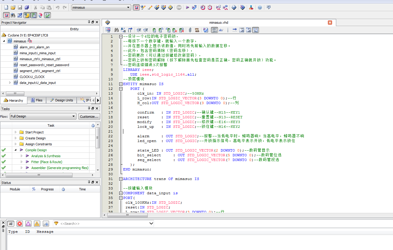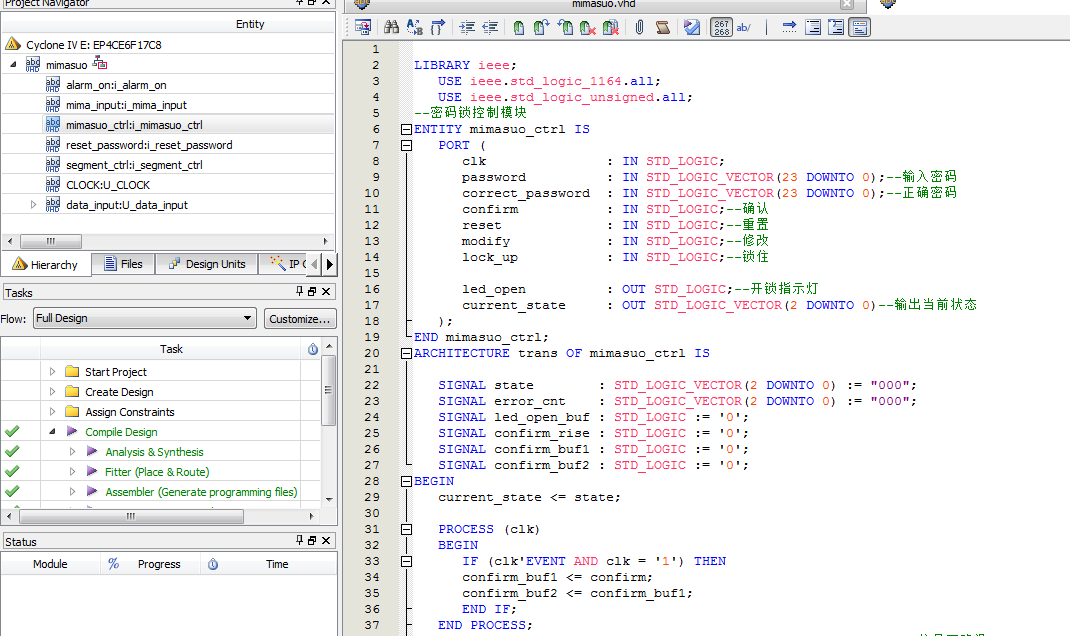 名称:基于FPGA的6位的电子密码锁VHDL代码Quartus? AX301开发板