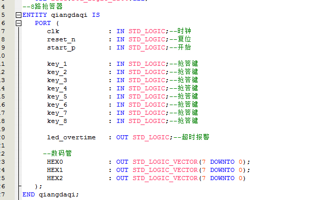LIBRARY?ieee; ???USE?ieee.std_logic_1164.all; --8路抢答器 ENTITY?qiangdaqi?IS ???PORT?( ??????clk????????????:?IN?STD_LOGIC;--时钟 ??????reset_n????????:?IN?STD_LOGIC;--复位 ??????start_p????????:?IN?STD_LOGIC;--开始 ?????? ??????key_1??????????:?IN?STD_LOGIC;--抢答键1 ??????key_2??????????:?IN?STD_LOGIC;--抢答键2 ??????key_3??????????:?IN?STD_LOGIC;--抢答键3 ??????key_4??????????:?IN?STD_LOGIC;--抢答键4 ??????key_5??????????:?IN?STD_LOGIC;--抢答键5 ??????key_6??????????:?IN?STD_LOGIC;--抢答键6 ??????key_7??????????:?IN?STD_LOGIC;--抢答键7 ??????key_8??????????:?IN?STD_LOGIC;--抢答键8 ?????? ??????led_overtime???:?OUT?STD_LOGIC;--超时报警 ?????? ??--数码管 ??????HEX0???????????:?OUT?STD_LOGIC_VECTOR(7?DOWNTO?0); ??????HEX1???????????:?OUT?STD_LOGIC_VECTOR(7?DOWNTO?0); ??????HEX2???????????:?OUT?STD_LOGIC_VECTOR(7?DOWNTO?0) ???); END?qiangdaqi; ARCHITECTURE?behavioral?OF?qiangdaqi?IS --分频模块,时钟分频到1Hz COMPONENT?fenping?IS ???PORT?( ??????clk_50M??:?IN?STD_LOGIC;--输入时钟 ??????clk_1Hz??:?OUT?STD_LOGIC--输出1Hz使能信号 ???); END?COMPONENT; ??? ???--显示模块 ???COMPONENT?display?IS ??????PORT?( ?????????clk????????????:?IN?STD_LOGIC; ?????????HEX0???????????:?OUT?STD_LOGIC_VECTOR(7?DOWNTO?0); ?????????HEX1???????????:?OUT?STD_LOGIC_VECTOR(7?DOWNTO?0); ?????????HEX2???????????:?OUT?STD_LOGIC_VECTOR(7?DOWNTO?0); time_down???????:?IN?STD_LOGIC_VECTOR(7?DOWNTO?0);--倒计时 ?????????qiangda????????:?IN?STD_LOGIC_VECTOR(3?DOWNTO?0) ??????); ???END?COMPONENT; ??? ???--抢答控制模块 ???COMPONENT?qiandda_ctrl?IS ??????PORT?( ??????clk?????????????:?IN?STD_LOGIC;--时钟 clk_1Hz?????????:?IN?STD_LOGIC;--1Hz时钟 ??????reset_n?????????:?IN?STD_LOGIC;--复位 ??????start_p?????????:?IN?STD_LOGIC;--开始 --8个抢答按键 ??????key_1???????????:?IN?STD_LOGIC; ??????key_2???????????:?IN?STD_LOGIC; ??????key_3???????????:?IN?STD_LOGIC; ??????key_4???????????:?IN?STD_LOGIC; ??????key_5???????????:?IN?STD_LOGIC; ??????key_6???????????:?IN?STD_LOGIC; ??????key_7???????????:?IN?STD_LOGIC; ??????key_8???????????:?IN?STD_LOGIC; ??????led_overtime????:?OUT?STD_LOGIC;--超时报警 ???time_down???????:?OUT?STD_LOGIC_VECTOR(7?DOWNTO?0);--倒计时 ??????qiangda?????????:?OUT?STD_LOGIC_VECTOR(3?DOWNTO?0)--抢答号 ??????); ???END?COMPONENT; ???SIGNAL?qiangda?????????????:?STD_LOGIC_VECTOR(3?DOWNTO?0); ???SIGNAL?clk_1Hz:?STD_LOGIC; SIGNAL?time_down???????:?STD_LOGIC_VECTOR(7?DOWNTO?0);--倒计时 BEGIN --调用分频模块,时钟分频到1Hz i_fenping:?fenping ???PORT?MAP??( ??????clk_50M???=>?clk,--输入时钟 ??????clk_1Hz???=>?clk_1Hz--输出1Hz使能信号 ???); --调用抢答控制模块 ???i_qiandda_ctrl?:?qiandda_ctrl ??????PORT?MAP?( ?????????clk?????????????=>?clk, clk_1Hz?????????=>?clk_1Hz, ?????????reset_n?????????=>?reset_n, ?????????start_p?????????=>?start_p, ????????? ?????????key_1???????????=>?key_1, ?????????key_2???????????=>?key_2, ?????????key_3???????????=>?key_3, ?????????key_4???????????=>?key_4, ?????????key_5???????????=>?key_5, ?????????key_6???????????=>?key_6, ?????????key_7???????????=>?key_7, ?????????key_8???????????=>?key_8, ????????? ?????????led_overtime????=>?led_overtime,--超时报警 ?????????time_down???=>?time_down,--倒计时 ?????????qiangda?????????=>?qiangda--抢答号?? ??????); ? ??? ???--调用显示模块 ???i_display?:?display ??????PORT?MAP?( ?????????clk?????????????=>?clk, ?????????time_down???????=>?time_down,--倒计时 ?????????qiangda?????????=>?qiangda, ?????????HEX0????????????=>?HEX0, ?????????HEX1????????????=>?HEX1, ?????????HEX2????????????=>?HEX2 ??????); ??? END?behavioral;