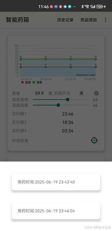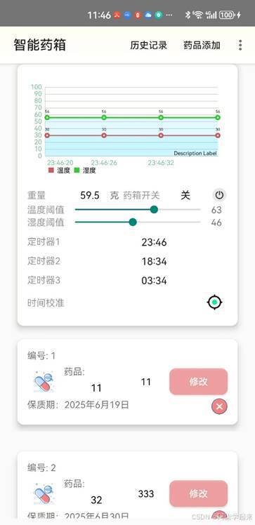APP端作为用户交互界面,具备数据可视化与远程控制功能。UI界面动态展示温湿度曲线、药品存量及用药记录,支持设置用药计划并同步至硬件端执行。药品管理模块可登记药品名称、剩余量、重量及保质期信息,同时提供指纹录入功能。历史数据追溯与用药提醒功能形成完整用药闭环,实现智能化药品管理与健康监护。