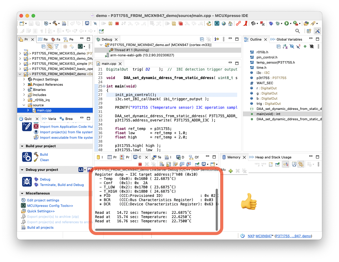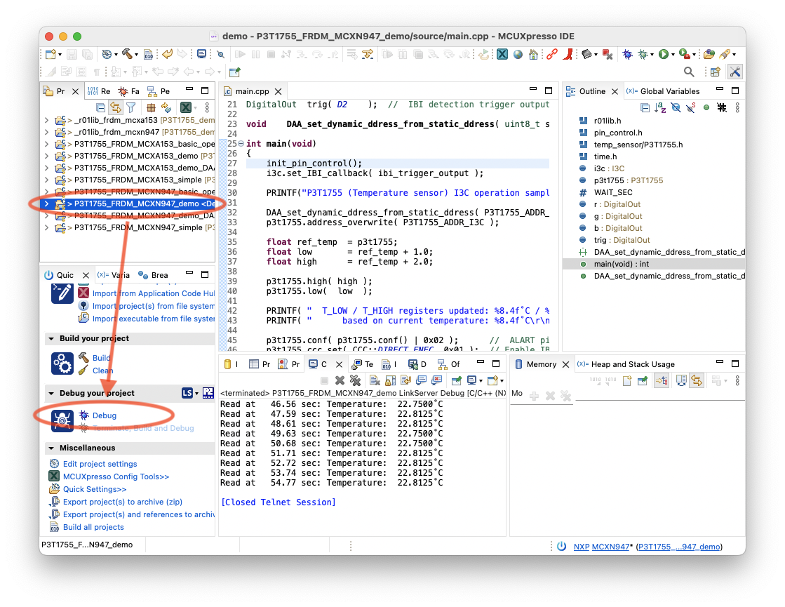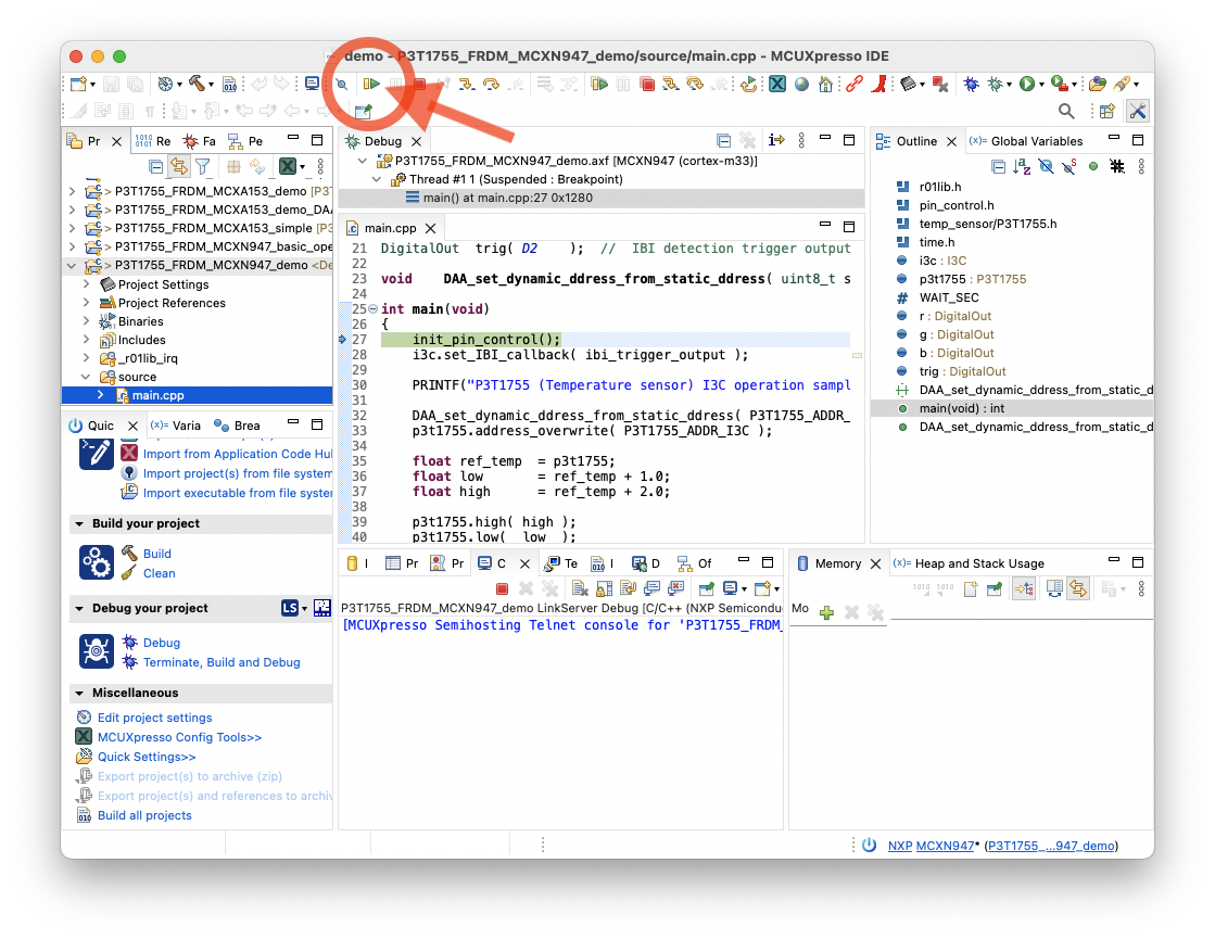 P3T1755_FRDM_MCXN947_demo或项目P3T1755_FRDM_MCXA153_demo - 单击“快速启动面板”中的“调试”图标或图标工具栏中的“开始调试项目”图标(蓝色虫子图标)
