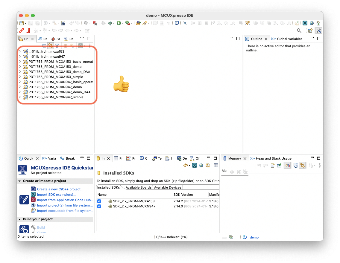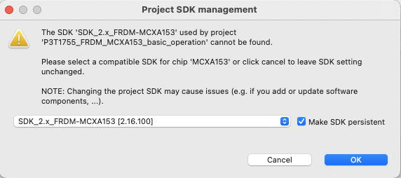 ?注意?:即使您使用 MCUXpresso SDK v2.16.0,也可能会弹出选择 SDK 的对话框。在这种情况下,用户可能无需选择 SDK 版本。点击“OK”按钮即可关闭所有项目都会显示的对话框。