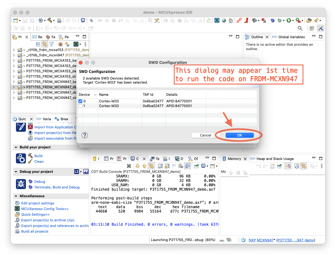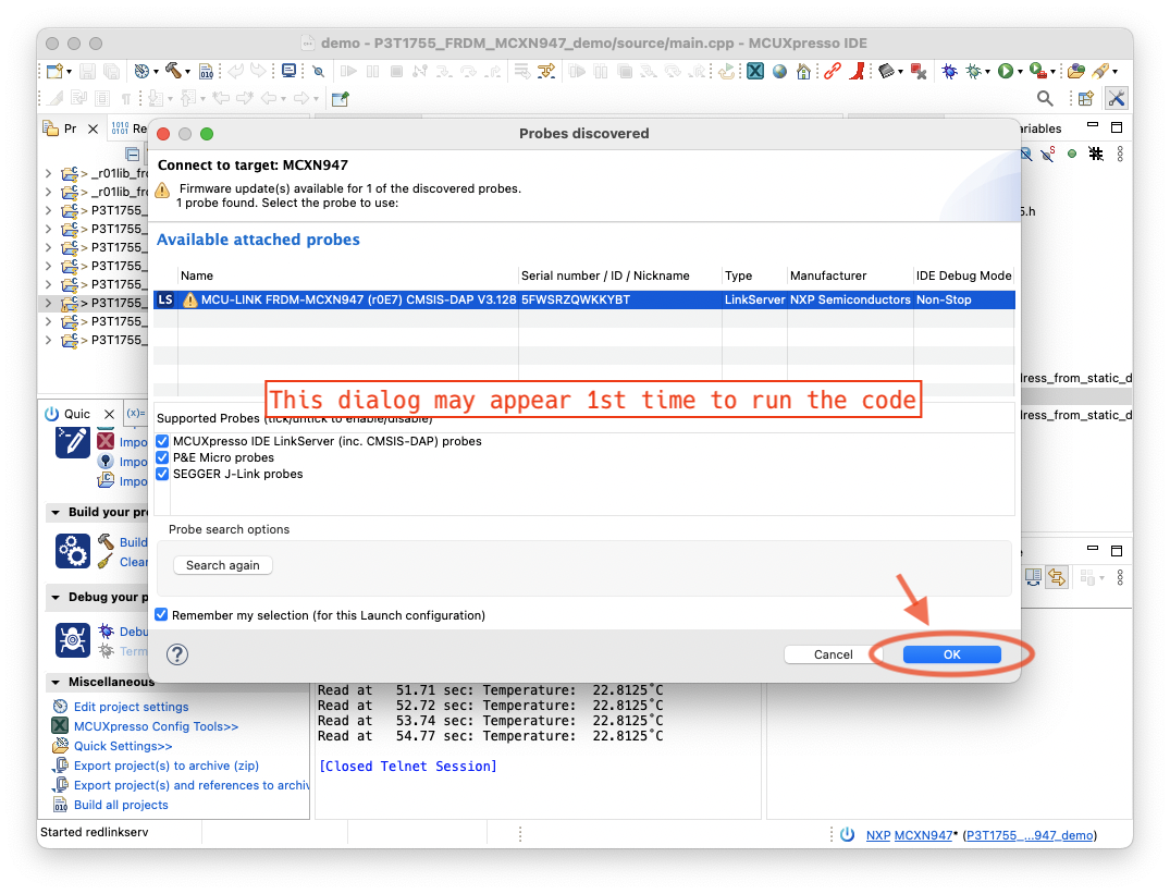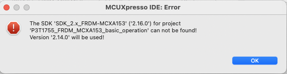 ?注意?:如果您使用的是 MCUXpresso SDK v2.14.x,IDE 将显示错误消息“未找到 SDK v2.16,它将使用 v2.14.x”。这是预期消息,您只需按“确定”按钮即可使用代码。每个项目都会显示此消息。每次按“确定”按钮即可。