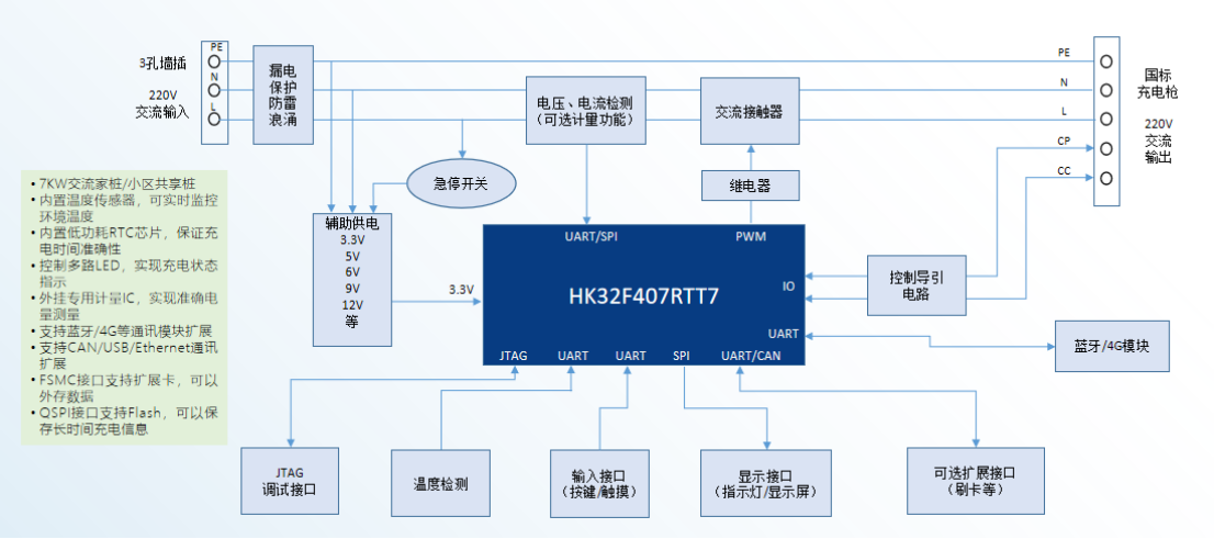 (1)主控单元:以HK32F407?为核心,负责整个充电交流桩的控制和管理,运行各种充电算法和控制逻辑,实现对充电过程的精确控制和管理。