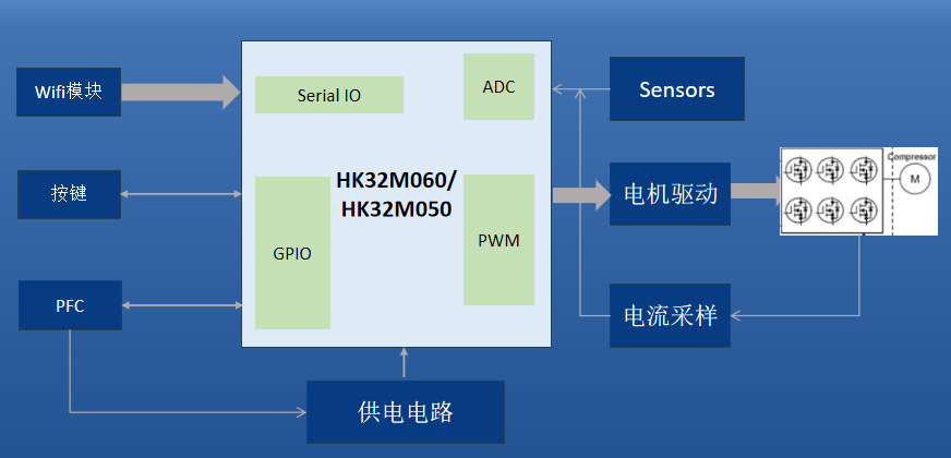 航顺技术员热情回应,提供了详细的技术文档、开发板以及案例参考。老陈拿到开发板后,看到HK32M060 MCU 丰富的外设接口,眼睛一亮。它配备了3个16 位高精度定时器,其中定时器 1 带有 3 路互补输出,能精准输出 PWM 波驱动压缩机电机,确保转速平稳调节;还有 12 位快速 ADC 转换模块,转换速率高达 1Msample/s,配合内部高精度基准电压源,可对压缩机的温度、压力等模拟信号进行快速精确采集,误差极小,这些功能恰好能满足压缩机对转速控制、温度监测的精准需求,老陈决定尝试此方案。