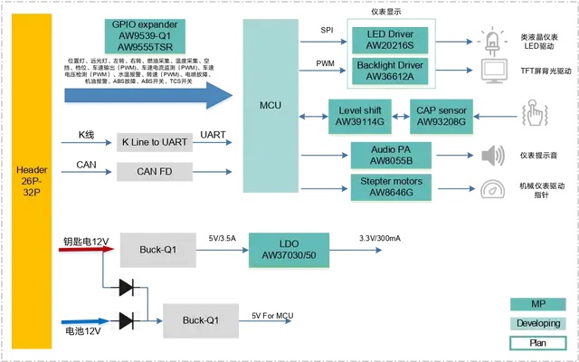 在摩托车仪表产品领域,艾为除了上述3类产品外,还提供框图中所示的背光、电源、音频等系列产品,供您参考选用。