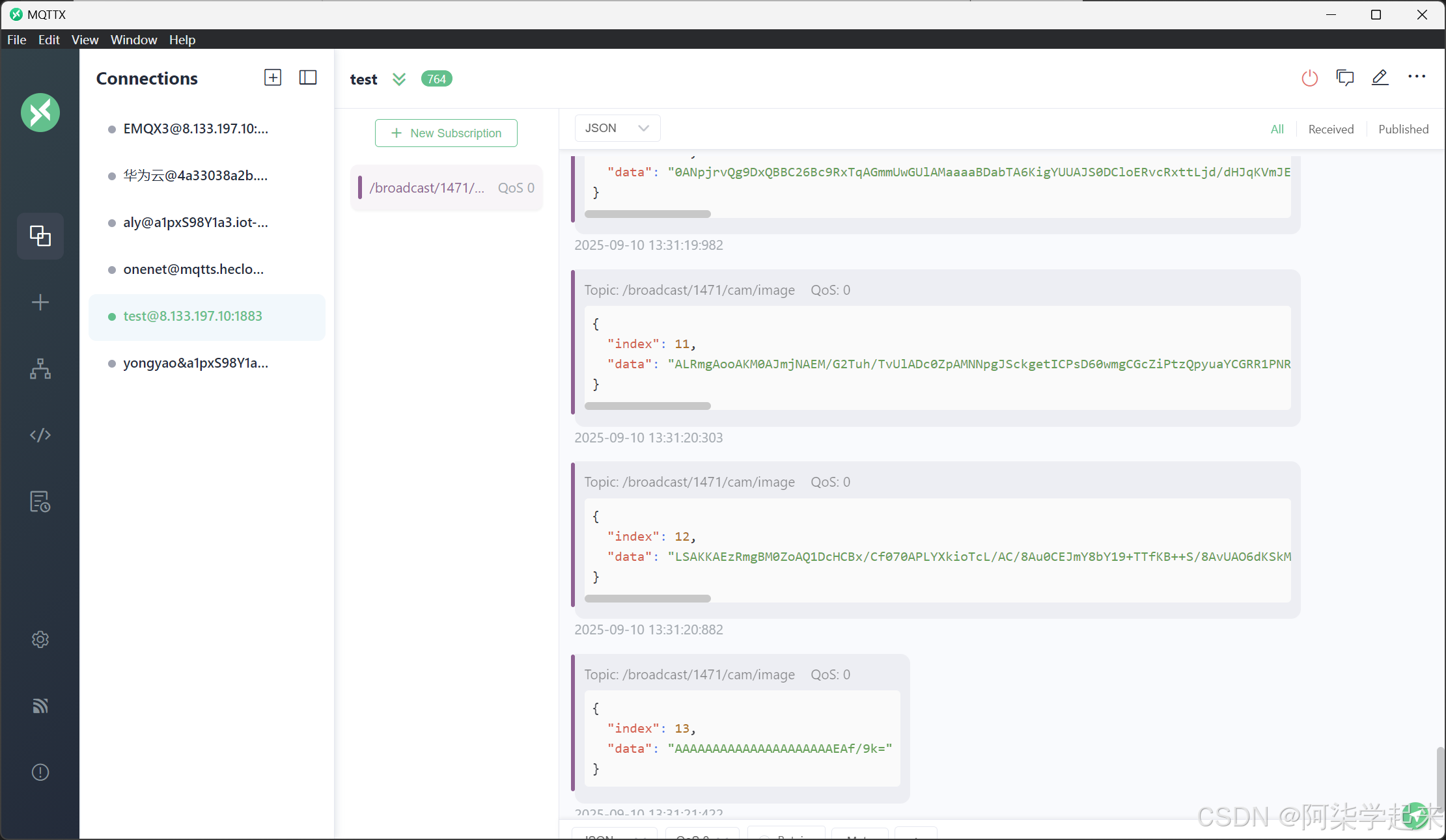 这个就需要两个设备 通过订阅设备发送的mqtt主题 实现base64 数据的发送,应为数据过长,所以采用了分段发送,每段最长数据我规定的512