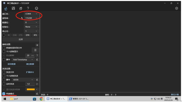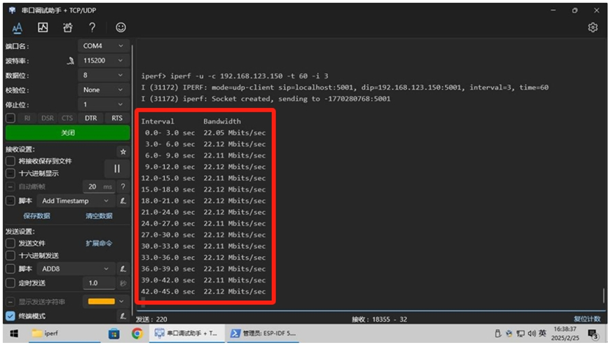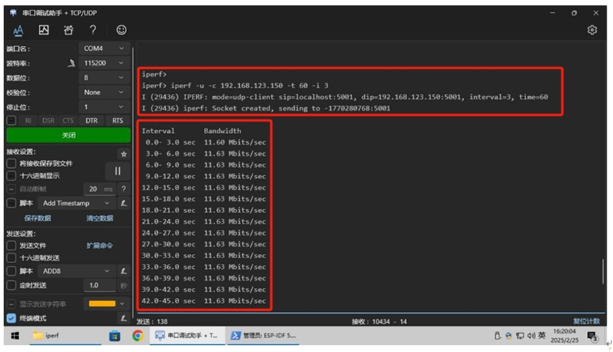 在PC端使用 Iperf 软件,我们输入命令为 iperf -u -s , 而在ESP IDF这儿使用串口调试助手软件,接着输入命令 iperf -u -c xxx.xxx.xxx.xxx -t 60 -i 3