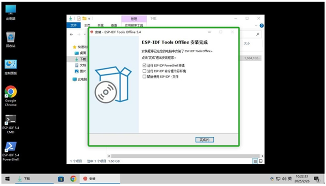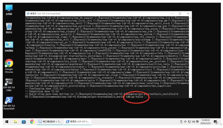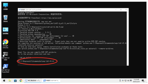 我们点击桌面上的ESP-IDF 5.4 CMD 或 ESP-IDF 5.4 PowerShell ,这儿使用的是后者,相关的工具连接都配置好了,我们不用再手动去配置。然后,我们切换到 c:Espressifframeworksesp-idf-v5.4examplesget-startedhello_world 目录中。