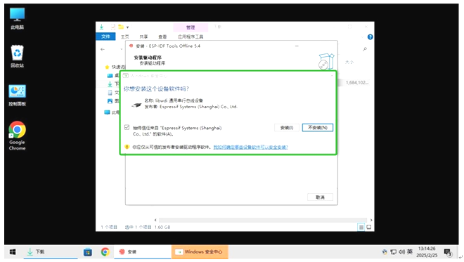 *步骤4:在安装中途,ESP IDF会出现一个窗口:是否安装USB 转 UART 芯片驱动?