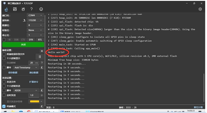 *步骤4:这时候,我们可以在”串口调试助手”中,看到ESP C3与SPI以太网DM9051ANX模块运行起来,并且输出 “Hello world!”,那就表示SPI以太网DM9051ANX通信成功。