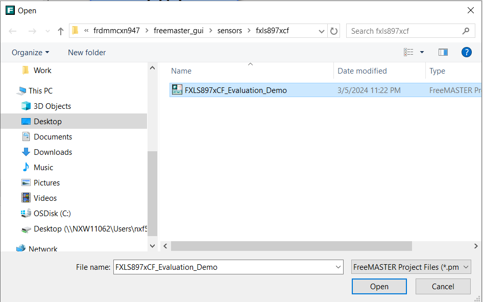 - 选择“FXLS897xCFEvaluationDemo.pmpx”传感器演示项目。点击“打开”。