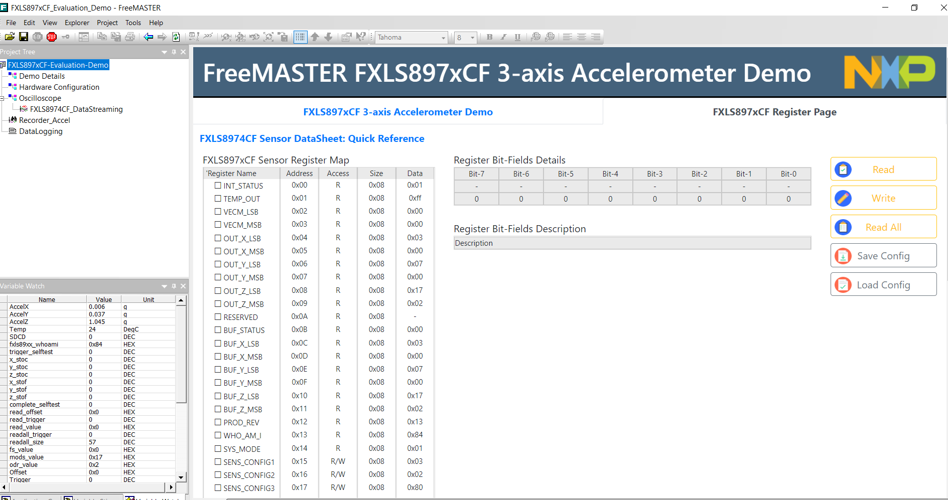 此示例演示了如何结合 ISSDK 和 FreeMASTER 为我们的客户创建 FXLS89xxxF 3 轴加速度计评估 GUI,以便使用带有传感器扩展板的传感器开发工具来评估该传感器。