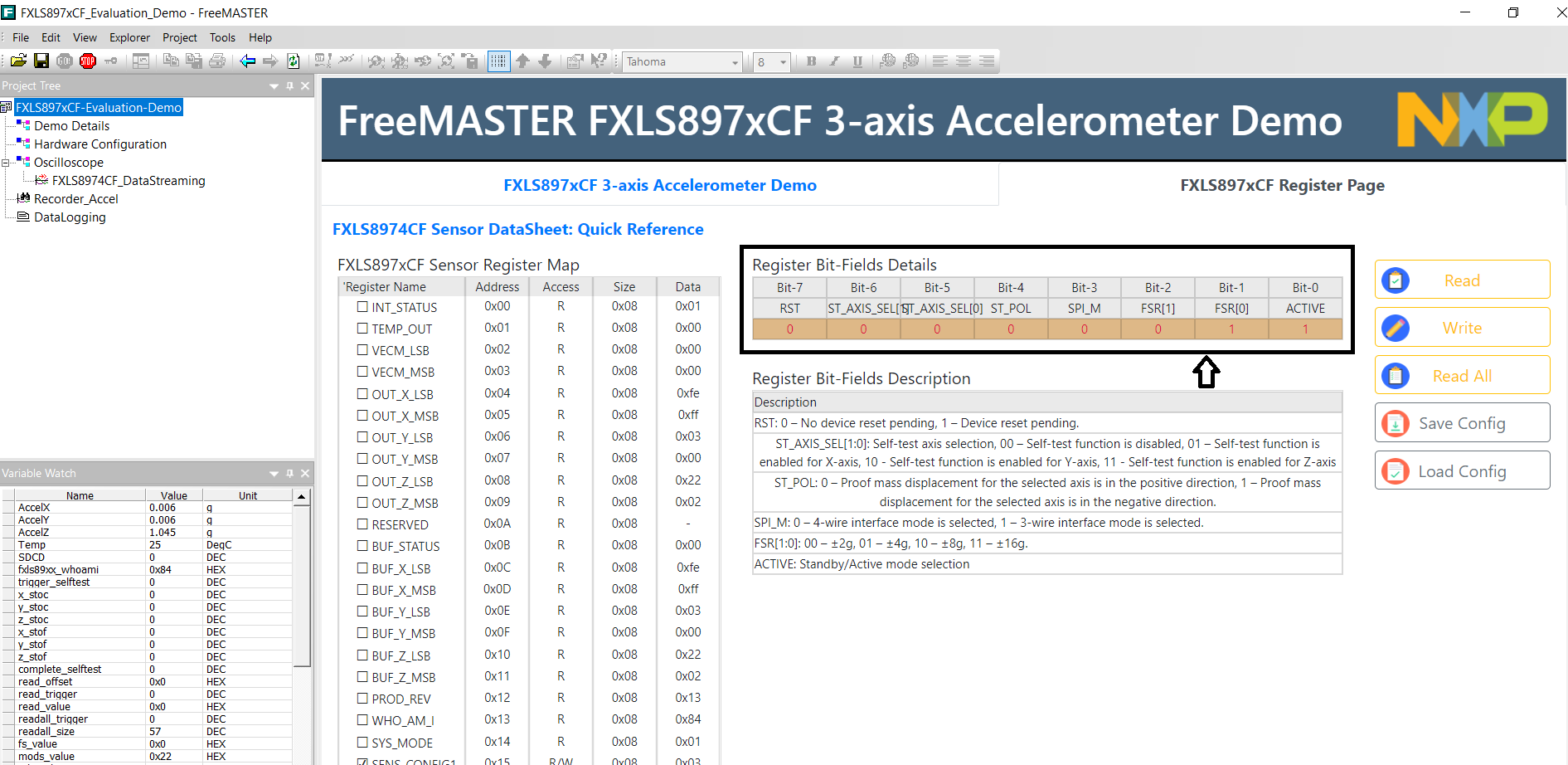 - 点击“FXLS8974CF 寄存器页面”选项卡,访问 FXLS8974CF 寄存器集。点击“读取全部”可实时查看 FXLS8974CF 传感器寄存器的瞬时值。