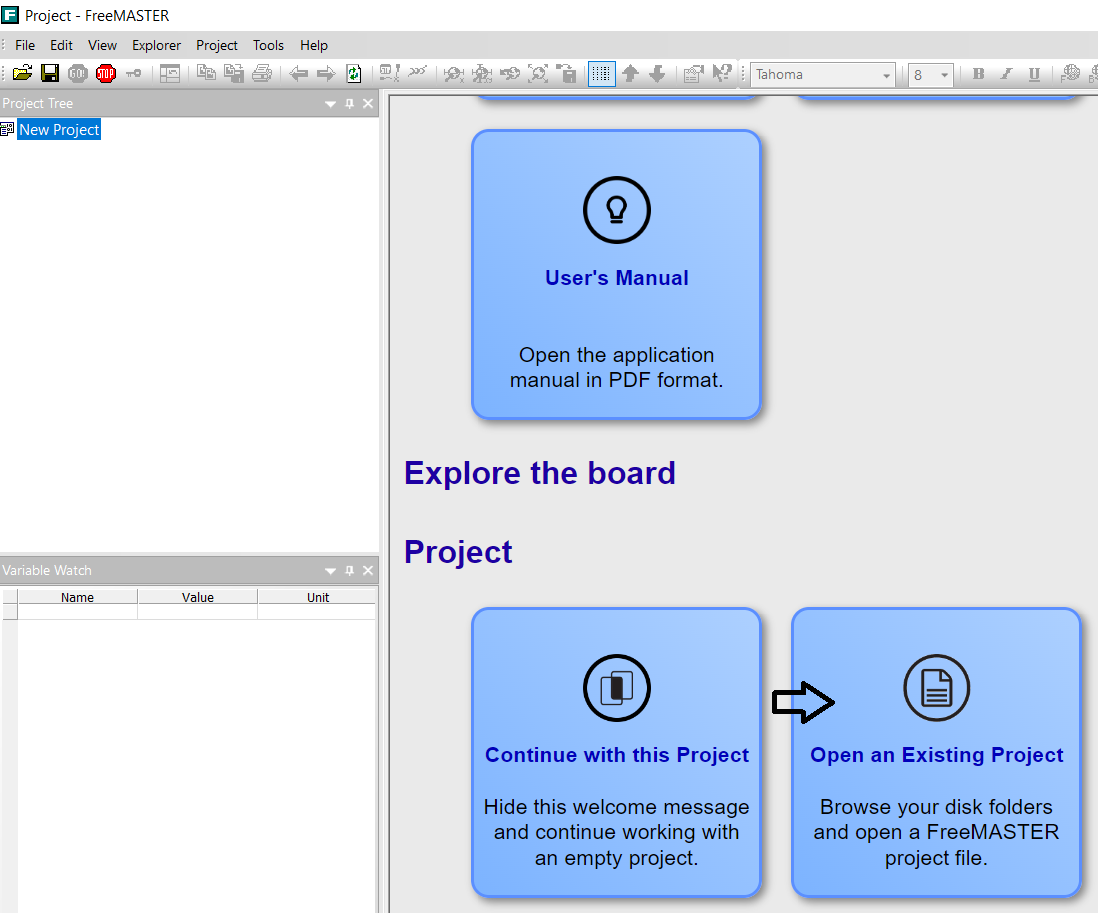 - FreeMASTER 打开“打开现有项目”选项。选择该选项。