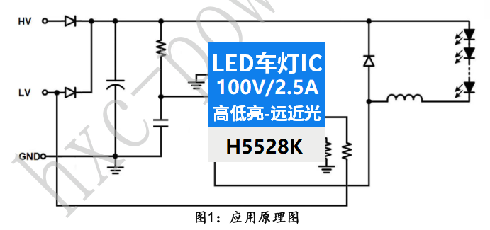 • 惠洋科技H5528K 100V高耐压2.5A 支持24V30V36V48V60V72V80V降压6V9V12V车灯供电恒流芯片IC 高低亮.pdf