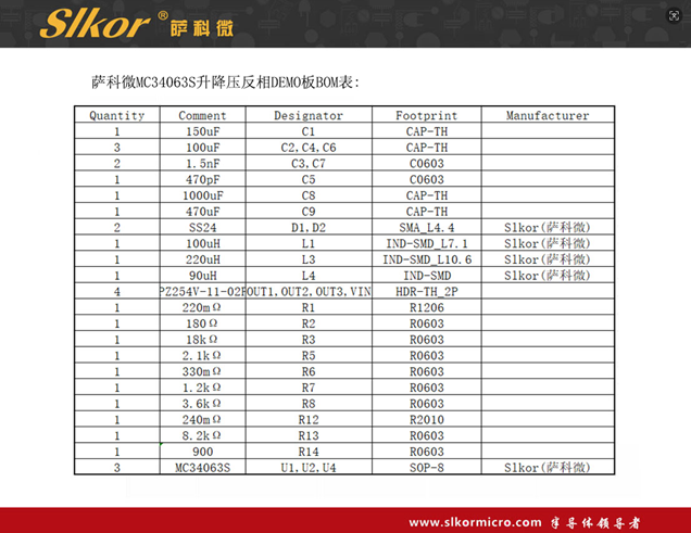 6.萨科微MC34063S升降压反相DEMO板BOM表信息如下: