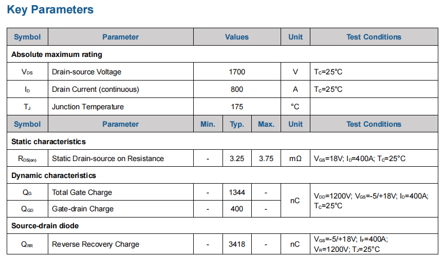 3.?参数范围:VDS:650~1700V? ?ID:400~1000A? ?RDS(on)?:1.3~6.5mΩ