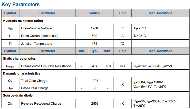 4. 参数范围:? ? VDS:1700V? ? ID:600A? ? RDS(on)?:4.3mΩ