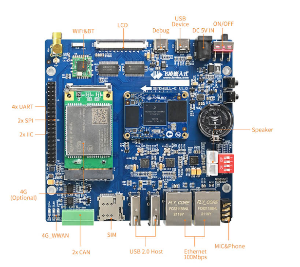 OKMX6ULL-C开发板基于NXP i.MX6ULL处理器开发设计,采用低功耗的ARM Cortex-A7架构,运行速度高达800MHz。采用核心板+底板结构,其核心板尺寸仅40*29mm,适应更多体积受限的应用场景,原生支持8路UART、2路Ethernet、2路CAN-bus总线、2路USB 2.0、LCD等常用接口。